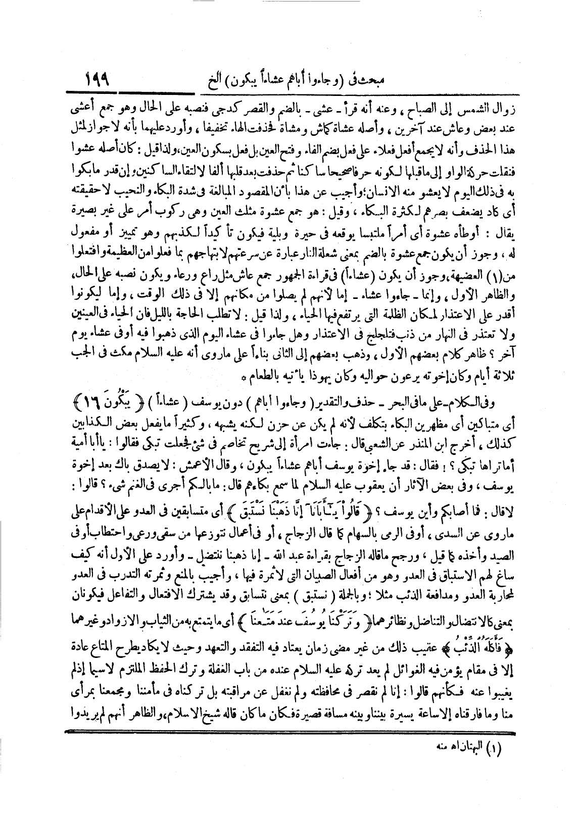زوال الشمس إلى الصباح وعنه أنه قريء عشي بالضم والقصر كدجي فنصبه على الحال وهو جمع أعشى عند بعض وعاش عند آخرين وأصله عشاة كماش ومشاة فحذفت الهاء تخفيفا وأورد عليهما بأنه لا جواز لمثل هذا الحذف وأنه لا يجمع أفعل فعلاء على فعل بضم الفاء وفتح العين بل فعل بسكون العين ولذا قيل : كان أصله عشوا فنقلت حركة الواو إلى ما قبلها لكونه حرفا صحيحا ساكنا ثم حذفت بعد قلبها ألفا لإلتقاء الساكنين وإن قدر ما بكوا به في ذلك اليوم لا يعشو منه الإنسان وأجيب عن هذا بأن المقصود المبالغة في شدة البكاء والنحيب لا حقيقته أي كاد يضعف بصرهم لكثرة البكاء وقيل : هو جمع عشوة مثلث العين وهي ركوب أمر على غير بصيرة يقال : أوظأة عشوة أي أمرا ملتبسا يوقعه في حيرة وبلية فيكون تأكيدا لكذبهم وهو تمييز أو مفعول له وجوز أن يكون جمع عشوة بالضم بمعنى شعلة النار عبارة عن سرعتهم لإبتهاجهم بما فعلوا من العظيمة وافتعلوا من العظيهة وجوز أن يكون عشاءا أي في قراءة الجمهور جمع عاش مثل راع ورعاء ويكون نصبه على الحال والظاهر الأول وإنما جاءوا عشاء إما لأنها لا يصلوا من مكانهم إلا في ذلك الوقت وإما ليكونوا أقدر على الإعتذار لمكان الظلمة التي يرتفع فيها الحيباء ولذا قيل : لا تطلب الحاجة بالليل فإن الحياء في العينين ولا تعتذروا في النهار من ذنب فتلجلج في الإعتذار وهل جاءوا في عشاء اليوم الذي ذهبو فيه أو في عشاء يوم آخر ظاهر كلان بعضهم الأول وذهب بعضهم إلى الثاني بناءا على ما روي أنه عليه السلام مكث في الجب ثلاثة أيام وكان إخوته يرعون حواليه وكان يهوذا يأتيه بالطعام