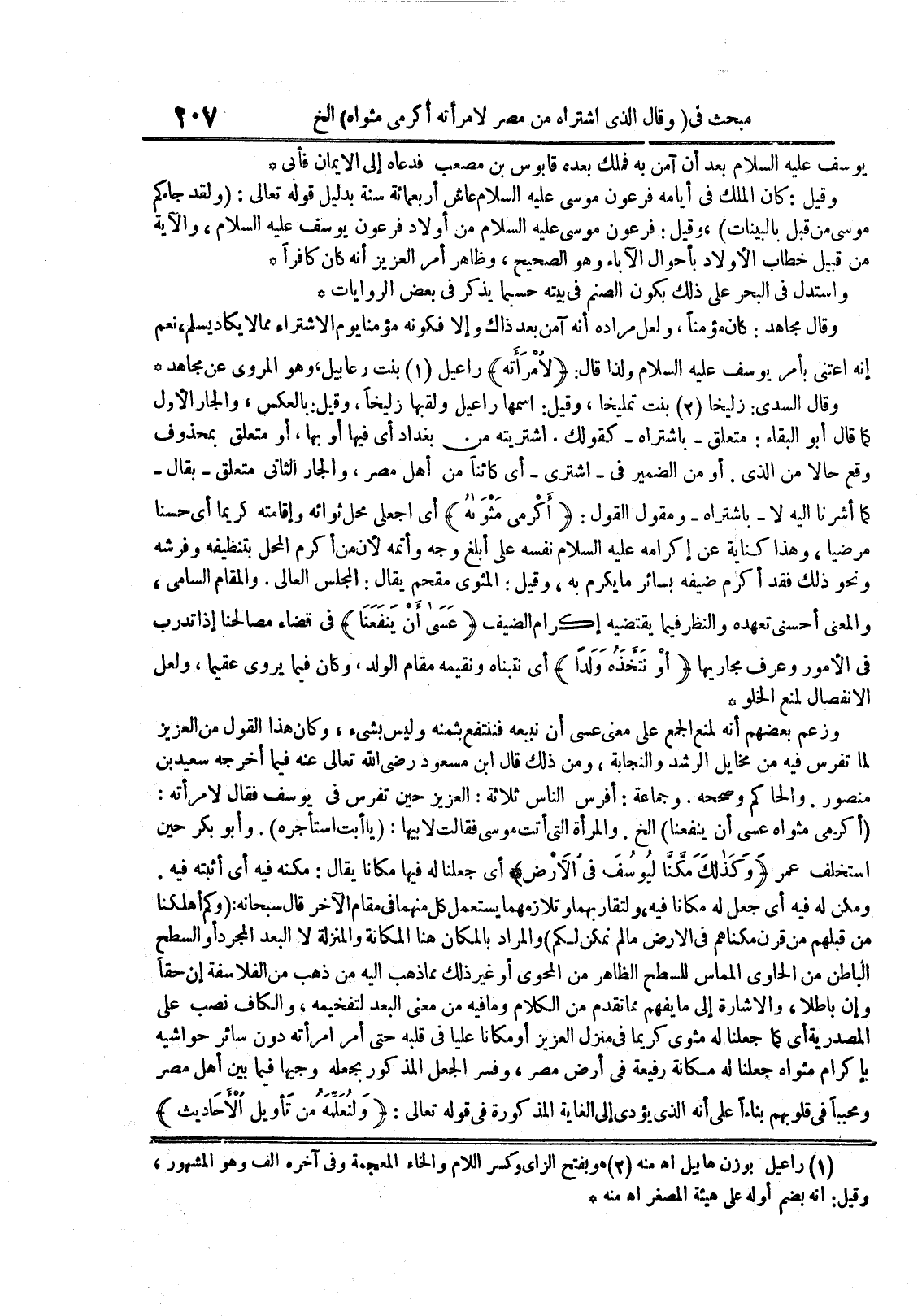 وقال السدي : زليخا 2 بنت تمليخا وقيل : اسمها راعيل ولقبها زليخا وقيل : بالعكس والجار الأول كما قال أبو البقاء : متعلق باشتراه كقولك اشتريته من بغداد أي فيها أو بها أو متعلق بمحذوف وقع حالا من الذي أو من الضمير في اشتري أي كائنا من أهل مصر والجار الثاني متعلق بقال كما أشرنا إليه لا باشتراه ومقول القول : أكرمي مثوه أي اجعلي محل ثوائه وإقامته كريما أي حسنا مرضيا وهذا كناية عن إكرامه عليه السلام نفسه على أبلغ وجه وأتمه لأن من أكرم المحل بتنظيفه وفرشه ونحو ذلك فقد أكرم ضيفه بسائر ما يكرم به وقيل : المثوى مقحم يقال : المجلس العالي والمقام السامي والمعنى أحسني تعهده والنظر فيما يقتضيه إكرام الضيف عسى أن ينفعنا في قضاء مصالحنا إذا تدرب في الأمور وعرف مجاريها أو نتخذه ولدا أي نتبناه ونقيمه مقام الولد وكان فيما يروى عقيما ولعل الإنفصال لمنع الخلو