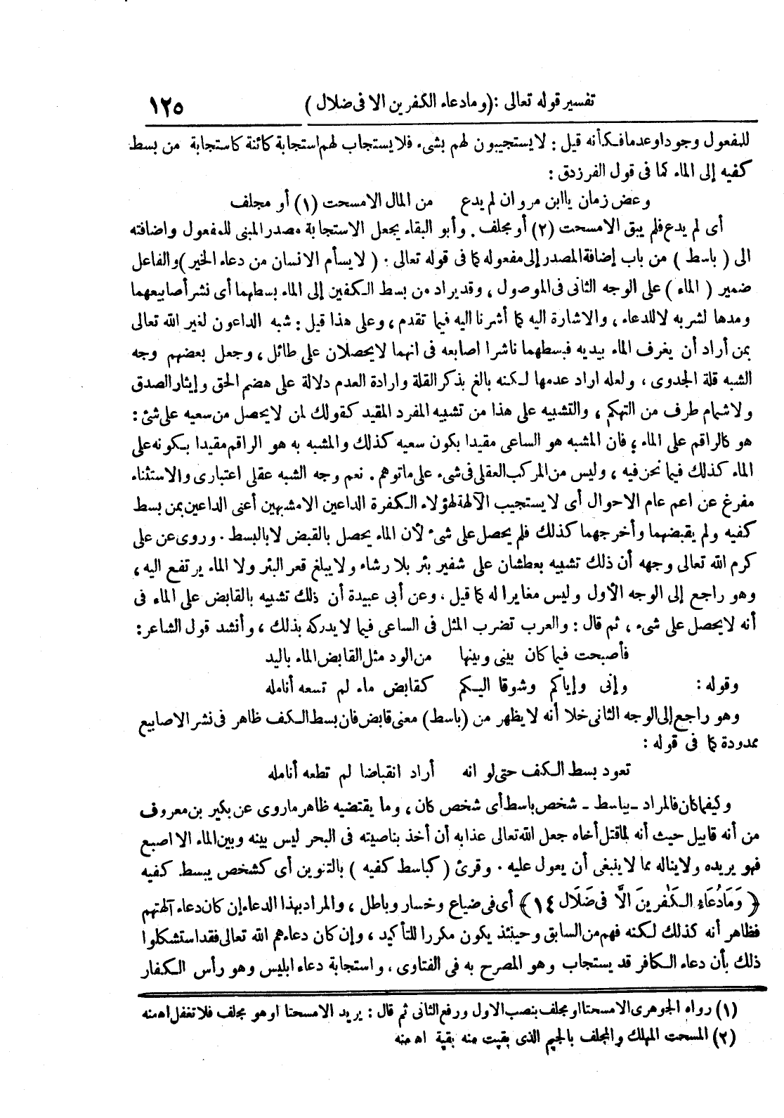 للمفعول وجودا وعدما فكأنه قيل : لايستجيبون لهم بشيء فلا يستجاب لهم استجابة كائنة كاستجابة من بسط كفيه إلى الماء كما في قول الفرزدق : وعض زمان ياابن مروان لم يدع من المال الا مسحت 1 أو مجلف أي لم يدع فلم يبق الا مسحت 2 أو مجلف وأبو البقاء يجعل الاستجابة مصدر المبني للمفعول واضافته الى باسط من باب إضافة المصدر إلى مفعوله كما في قوله تعالى لايسأم الانسان من دعاء الخير والفاعل ضمير الماء على الوجه الثاني في الموصول وقد يراد من بسط الكفين إلى الماء بسطهما أي نشر أصابيعهما ومدها لشربه لا للدعاء والاشارة اليه كما أشرنا اليه فيما تقدم وعلى هذا قيل : شبه الداعون لغير الله تعالى بمن أراد أن يعرف الماء بيديه فبسطهما ناشرا اصابعه في انهما لايحصلان على طائل وجعل بعضهم وجه الشبه قلة الجدوى ولعله أراد عدمها لكنه بالغ بذكر القلة وارادة العدم دلالة على هضم الحق وإيثار الصدق ولاشمام طرف من التهكم والتشبيه على هذا من تشبيه المفرد المقيد كقولك لمن لايحصل من سعيه على شيء : هو كالراقم على الماء فان المشبه هو الساعي مقيدا بكون سعيه كذلك والمشبه به هو الراقم مقيدا بكونه على الماء كذلك فيما نحن فيه وليس من المركب العقلي في شيء على ماتوهم نعم وجه الشبه عقلي اعتباري والاستثناء مفرغ عن اعم عام الاحوال أي لايستجيب الآلهة لهؤلاء الكفرة الداعين الا مشبهين أعني الداعين بمن بسط كفيه ولم يقبضهما وأخرجهما كذلك فلم يحصل على شيء لأن الماء يحصل بالقبض لا بالبسط وروى عن علي كرم الله تعالى وجهه أن ذلك تشبيه بعطشان على شفير بئر بلا رشاء ولا يبلغ قعر البئر ولا الماء يرتفع اليه وهو راجع إلى الوجه الأول وليس مغايرا له كما قيل وعن أبي عبيدة أن ذلك تشبيه بالقابض على الماء في أنه لايحصل على شيء ثم قال : والعرب تضرب المثل في الساعي فيما لايدركه بذلك وأنشد قول الشاعر : فأصبحت فيما كان بيني وبينها من الود مثل القابض الماء باليد وقوله : وإني وإياكم وشوقا اليكم كقابض ماء لم تسعه أنامله وهو راجع إلى الوجه الثاني خلا أنه لايظهر من باسط معنى قابض فان بسط الكف ظاهر في نشر الاصابيع ممدودة كما في قوله : تعود بسط الكف حتى لو أنه أراد انقباضا لم تطعه أنامله وكيفما كان فالمراد بباسط شخص باسط أي شخص كان وما يقتضيه ظاهر ماروى عن بكير بن معروف من أنه قابيل حيث أنه لما قتل أخاه جعل الله تعالى عذابه أن أخذ بناصيته في البحر ليس بينه وبين الماء الا اصبع فهو يريده مما لاينبغي أن يعول عليه وقريء كباسط كفيه بالتنوين أي كشخص يبسط كفيه وما دعاء الكفرين الا في ضلال