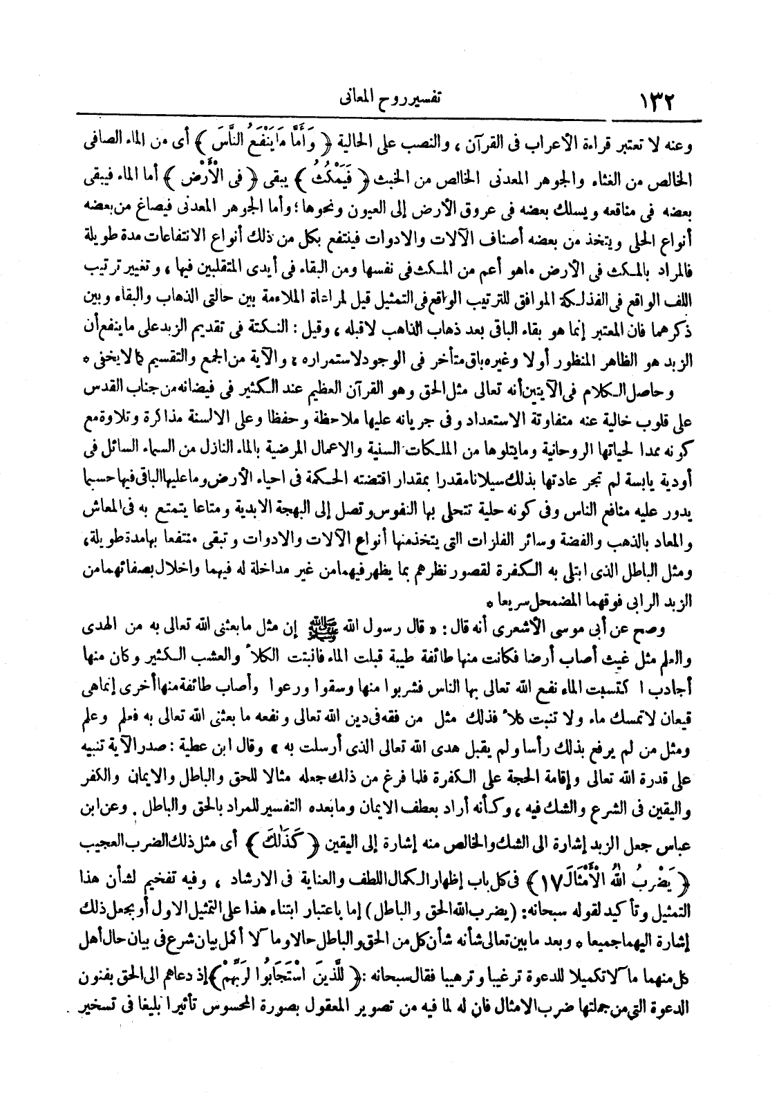 وعنه ولاتعتبر قراءة الاعراب في القرآن والنصب على الحالية وأما ماينفع الناس أي من الماء الصافي الخالص من الغثاء والجوهر المعدني الخالص من الخبث فيمكث يبقى في الأرض أما الماء فيبقى بعضه في مناقعه ويسلك بعضه في عروق الأرض إلى العيون ونحوها وأما الجوهر المعدني فيصاغ من بعضه أنواع الحلي ويتخذ من بعضه أصناف الآلات والادوات فينتفع بكل من ذلك أنواع الانتفاعات مدة طويلة فالمراد بالمكث في الأرض ماهو أعم من المكث في نفسها ومن البقاء في أيدي المتقلبين فيها وتغيير ترتيب اللف الواقع في الفذلكة الموافق للترتيب الواقع في التمثيل قيل لمراعاة الملاءمة بين حالتي الذهاب والبقاء وبين ذكرهما فان المعتبر إنما هو بقاء الباقي بعد ذهاب الذاهب لاقبله وقيل : النكتة في تقديم الزبد على ما ينفع أن الزبد هو الظاهر المنظور أولا وغيره باق متأخر في الوجود لاستمراره والآية من الجمع والتقسيم كما لايخفى