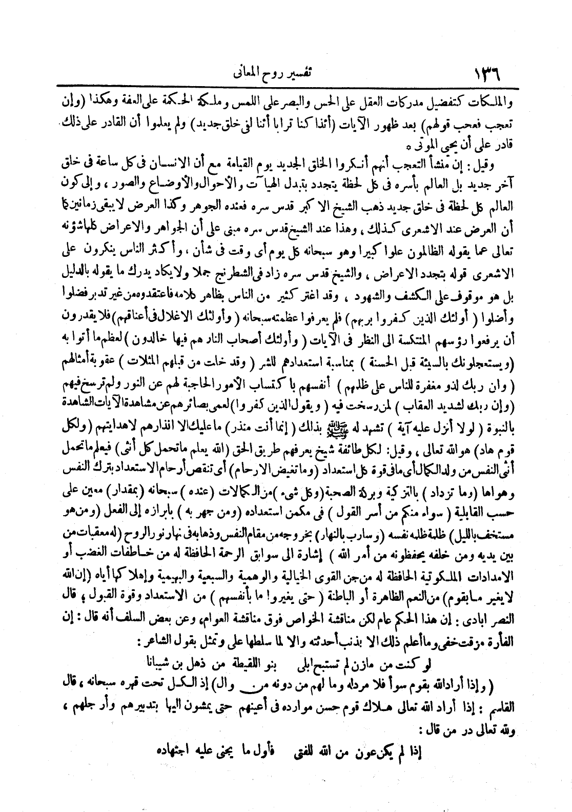 وقيل : إن منشأ التعجب أنهم أنكروا الخلق الجديد يوم القيامة مع أن الانسان في كل ساعة في خلق آخر جديد بل العالم بأسره في كل لحظة يتجدد بتبدل الهيآت والأحوال والأوضاع والصور وإلى كون العالم كل لحظة في خلق جديد ذهب الشيخ الأكبر قدس سره فعنده الجوهر وكذا العرض لايبقى زمانين كما أن العرض عند الاشعري كذلك وهذا عند الشيخ قدس سره مبني على أن الجواهر والاعراض كلها شؤنه تعالى عما يقوله الظالمون علوا كبيرا وهو سبحانه كل يوم أي وقت في شأن وأكثر الناس ينكرون على الاشعري قوله بتجدد الاعراض والشيخ قدس سره زاد في الشطرنج جملا ولا يكاد يدرك مايقوله بالدليل بل هو موقوف على الكشف والشهود وقد اغتر كثير من الناس بظاهر كلامه فاعتقدوه من غير تدبر فضلوا وأضلوا أولئك الذين كفروا بربهم فلم يعرفوا عظمته سبحانه وأولئك الاغلال في أعناقهم فلا يقدرون أن يرفعوا رؤسهم المنتكسة الى النظر في الآيات وأولئك أصحاب النار هم فيها خالدون لعظم ماأتوا به ويستعجلونك بالسيئة قبل الحسنة بمناسبة استعدادهم للشر وقد خلت من قبلهم المثلات عقوبة أمثالهم وان ربك لذو مغفرة للناس على ظلمهم أنفسهم باكتساب الأمور الحاجبة لهم عن النور ولم ترسخ فيهم وإن ربك لشديد العقاب لمن رسخت فيه ويقول الذين كفروا لعمى بصائرهم عن مشاهدة الآيات الشاهدة بالنبوة لولا أنزل عليه آية تشهد له صلى الله عليه و سلم بذلك إنما أنت منذر ما عليك الا انذارهم لا هدايتهم والكل قوم هاد هو الله تعالى وقيل : لكل طائفة شيخ يعرفهم طريق الحق الله يعلم ماتحمل كل أنثى فيعلم ماتحمل أنثى النفس من ولد الكمال أي ما في قوة كل استعداد وما تغيض الارحام أي تنقص أرحام الاستعداد بترك النفس وهواها وما تزداد بالتزكية وبركة الصحبة وكل شيء من الكمالات عنده سبحانه بمقدار معين على حسب القابلية سواء منكم من أسر القول في مكمن استعداده ومن جهر به بابرازه إلى الفعل ومن هو مستخف بالليل ظلمة ظلمه نفسه وسارب بالنهار بخروجه من مقام النفس وذهابه في نهار نور الروح له معقبات من بين يديه ومن خلفه يحفظونه من أمر الله إشارة الى سوابق الرحمة الحافظة له من خاطفات الغضب أو الامدادات الملكوتية الحافظة له من جن القوى الخيالية والوهمية والسبعية والبهيمية وإهلاكها أياه إن الله لايغير ما بقوم من النعم الظاهرة أو الباطنة حتى يغيروا ما بأنفسهم من الاستعداد وقوة القبول قال النصر ابادي : إن هذا الحكم عام لكن مناقشة الخواص فوق مناقشة العوام وعن بعض السلف أنه قال : إن الفأرة مزقت خفي وماأعلم ذلك الا بذنب أحدثته والا لما سلطها علي وتمثل بقول الشاعر : لو كنت من مازن لم تستبح ابلي بنو اللقيطة من ذهل بن شيبانا وإذا أراد الله بقوم سوءا فلا مرد له وما لهم من دونه من وال إذ الكل تحت قهره سبحانه قال القاسم : إذا أراد الله تعالى هلاك قوم حسن موارده في أعينهم حتى يمشون اليها بتدبيرهم وأرجلهم ولله تعالى در من قال : إذا لم يكن عون من الله للفتى فأول ما يجني عليه اجتهاده