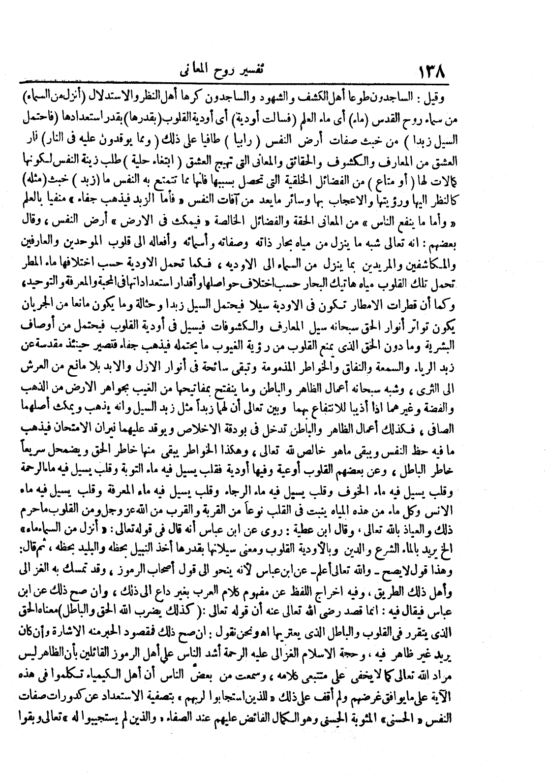 وقيل : الساجدون طوعا أهل الكشف والشهود والساجدون كرها أهل النظر والاستدلال أنزل من السماء من سماء روح القدس ماء أي ماء العلم فسالت أودية أي أودية القلوب بقدرها بقدر استعدادها فاحتمل السيل زبدا من خبث صفات أرض النفس رابيا طافيا على ذلك ومما يوقدون عليه في النار نار العشق من المعارف والكشوف والحقائق والمعاني التي تهيج العشق ابتغاء حلية طلب زينة النفس لكونها كمالات لها أو متاع من الفضائل الخلقية التي تحصل بسببها فانها مما تتمتع به النفس ما زبد خبث مثله كالنظر اليها ورؤيتها والاعجاب بها وسائر ما يعد من آفات النفس فأما الزبد فيذهب جفاء منفيا بالعلم وأما ماينفع الناس من المعاني الحقة والفضائل الخالصة فيمكث في الأرض أرض النفس وقال بعضهم : انه تعالى شبه ماينزل من مياه بحار ذاته وصفاته وأسمائه وأفعاله الى قلوب الموحدين والعارفين والمكاشفين والمريدين بما ينزل من السماء الى الاودية فكما تحمل الأودية حسب اختلافها ماء المطر تحمل تلك القلوب مياة هاتيك البحار حسب اختلاف حواصلها وأقار استعداداتها في المحبة والمعرفة والتوحيد وكما أن قطرات الامطار تكون في الاودية سيلا فيحتمل السيل زبدا وحثالة وما يكون مانعا من الجريان يكون تواتر أنوار الحق سبحانه سيل المعارف والكشوفات فيسيل في أودية القلوب فيحتمل من أوصاف البشرية وما دون الحق الذي يمنع القلوب من رؤية الغيوب ما يحتمله فيذهب جفاء فتصير حينئذ مقدسة عن زبد الرياء والسمعة والنفاق والخواطر المذمومة وتبقى سائحة في أنوار الأزل والابد بلا مانع من العرش الى الثرى وشبه سبحانه أعمال الظاهر والباطن وما ينفتح بمفاتيحها من الغيب بجواهر الارض من الذهب والفضة وغيرهما اذا أذيبا للانتفاع بهما وبين تعالى أن لهما زبدا مثل زبد السيل وانه يذهب ويمكث أصلهما الصافي فكذلك أعمال الظاهر والباطن تدخل في بودقة الاخلاص ويوقد عليهما نيران الامتحان فيذهب مافيه حظ النفس ويبقى ماهو خالص لله تعالى وهكذا الخواطر يبقى منها خاطر الحق ويضمحل سريعا خاطر الباطل وعن بعضهم القلوب أوعية وفيها أودية فقلب يسيل فيه ماء التوبة وقلب يسيل فيه ماء الرحمة وقلب يسيل فيه ماء الخوف وقلب يسيل فيه ماء الرجاء وقلب يسيل فيه ماء المعرفة وقلب يسيل فيه ماء الانس وكل ماء من هذه المياه ينبت في القلب نوعا من القربة والقرب من الله عز و جل ومن القلوب ما حرم ذلك والعياذ بالله تعالى وقال ابن عطية : روى عن ابن عباس أنه قال في قوله تعالى : أنزل من السماء ماء الخ يريد الماء الشرع والدين وبالأودية القلوب ومعنى سيلانها بقدرها أخذ النبيل بحظه والبليد بحظه ثم قال : وهذا قولا لايصح والله تعالى أعلم عن ابن عباس لأنه ينحو الى قول أصحاب الرموز قد تمسك به الغزالي وأهل ذلك الطريق وفيه اخراج اللفظ عن مفهوم كلام العرب بغير داع الى ذلك وان صح ذلك عن ابن عباس فيقال فيه : انما قصد رضي الله تعالى عنه أن قوله تعالى : كذلك يضرب الله الحق والباطل معناه الحق الذي يتقرر في القلوب والباطل الذي يعتريها اه ونحن نقول : ان صح ذلك فمقصود الحبر منه الاشارة وأن كان يريد غير ظاهر فيه وحجة الاسلام الغزالي عليه الرحمة أشد الناس على أهل الرموز القائلين بأن الظاهر ليس مراد الله تعالى كما لايخفى على متتبعي كلامه وسمعت من بعض الناس أن أهل الكيمياء تكلموا في هذه الآية على مايوافق غرضهم ولم أقف على ذلك للذين استجابوا لربهم بتصفية الاستعداد عن كدورات صفات النفس الحسنى المثوبة الحسنى وهو الكمال الفائض عليهم عند الصفاء والذين لم يستجيبوا له تعالى وبقوا