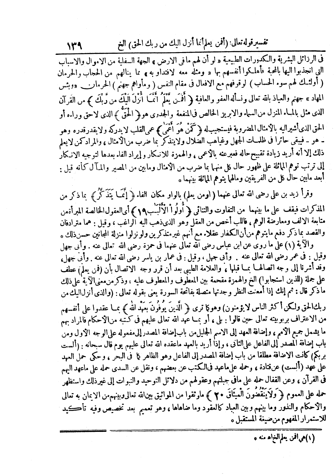 في الرزائل البشرية والكدورات الطبيعية لو أن لهم مافي الأرض الجهة السفلية من الاموال والاسباب التي انجذبوا اليها بالمحبة فأهلكوا أنفسهم بها ومثله معه لافتدوا به مما ينالهم من الحجاب والحرمان اولئك لهم سوء الحساب لوقوفهم مع الافعال في مقام النفس ومأواهم جهنم الحرمان وبئس المهاد جهنم والعياذ بالله تعالى ونسأله العفو والعافية أفمن يعلم أنما أنزل اليك من ربك من القرآن الذي مثل بالماء المنزل من السماء والابريز الخالص في المنفعة والجدوى هو الحق الذي لاحق وراءه أو الحق الذي أشير اليه بالامثال المضروبة فيستجيب له كمن هو أعمى عمى القلب لايدركه ولا يقدر قدره وهو هو فيبقى حائرا في ظلمات الجهل وغياهب الضلال ولا يتذكر بما ضرب من الأمثال والمراد كمن لايعلم ذلك إلا أنه أريد زيادة تقبيح حاله فعبر عنه بالأعمى والهمزة للأنكار وإيراد الفاء بعدها لتوجيه الانكار إلى ترتب توهم المماثلة على ظهور حال كل منهما بما ضرب من الأمثال ومابين من المصير والمآل كأنه قيل : أبعد مابين حال كل من الفريقين ومالهما يتوهم المماثلة بينهما