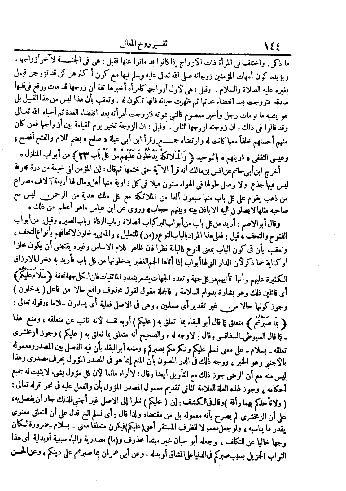 وقال أبو الاصم : أريد من كل باب من أبواب البر كباب الصلاة وباب الزكاة وباب الصبر وقيل : من أبواب الفتوح والتحف قيل : فعلى هذا المراد بالباب النوع و من للتعليل والمعنى يدخلون لاتحافهم بأنواع التحف وتعقب بأن في كون الباب بمعنى النوع كالبابة نظرا فان ظاهر كلام الاساس وغيره يقتضي أن يكون مجازا أو كناية عما ذكر لأن الدار التي لها أبواب إذا أتاها الجم الغفير يدخلونها من كل باب فأريد به دخول الارزاق الكثيرة عليهم وأنها تأتيهم من كل جهة وتعدد الجهات يشعر بتعدد المائتيات فان لكل جهة تحفة سلام عليكم أي قائلين ذلك وهو بشارة بدوام السلامة فالجملة مقول لقول محذوف واقع حالا من فاعل يدخلون وجوز كونها حالا من غير تقدير أي مسلمين وهي في الاصل فعلية أي يسلمون سلاما وقوله تعالى : بما صبرتم متعلق كما قال أبو البقاء بما تعلق به عليكم أو به نفسه لأنه نائب عن متعلقه ومنع هذا كما قال السيوطي السفاقسي وقال : لاوجه له والصحيح أنه متعلق بما تعلق به عليكم وجوز الزمخشري تعلقه بسلام على معنى نسلم عليكم ونكرمكم بصبركم ومنعه أبو البقاء بأن فيه الفصل بين المصدر ومعموله بالأجنبي وهو الخبر ووجه ذلك في الدر المصون بأن المنع إنما هو في المصدر المؤول بحرف مصدري وهذا ليس منه مع أن الرضى جوز ذلك مع التأويل أيضا وقال : لا أراه مانعا لأن كل مؤول بشيء لايثبت له جميع أحكامه وجوز لهذه العلة العلامة الثاني تقديم معمول المصدر المؤول بأن والفعل عليه في نحو قوله تعالى : ولا تأخذكم بهما رأفة وقال في الكشف : إن عليكم نظرا إلى الاصل غير أجنبي فلذلك جاز أن يفصل به على أن الزمخشري لم يصرح بأنه معمول بل من مقتضاه ولذا قال : أي نسلم الخ فدل على أن التعلق معنوي يقدر ما يناسبه ولو جعل معمولا للظرف المستقر أعني عليكم فيكون متعلقا معنى بسلام ضرورة لكان وجها خاليا عن التكلف وجعله أبو حيان خبر مبتدأ محذوف و ما مصدرية والباء سببية أو بدلية أي هذا الثواب الجزيل بسبب صبركم في الدنيا على المشاق أو بدله وعن أبي عمران بما صبرتم على دينكم وعن الحسن