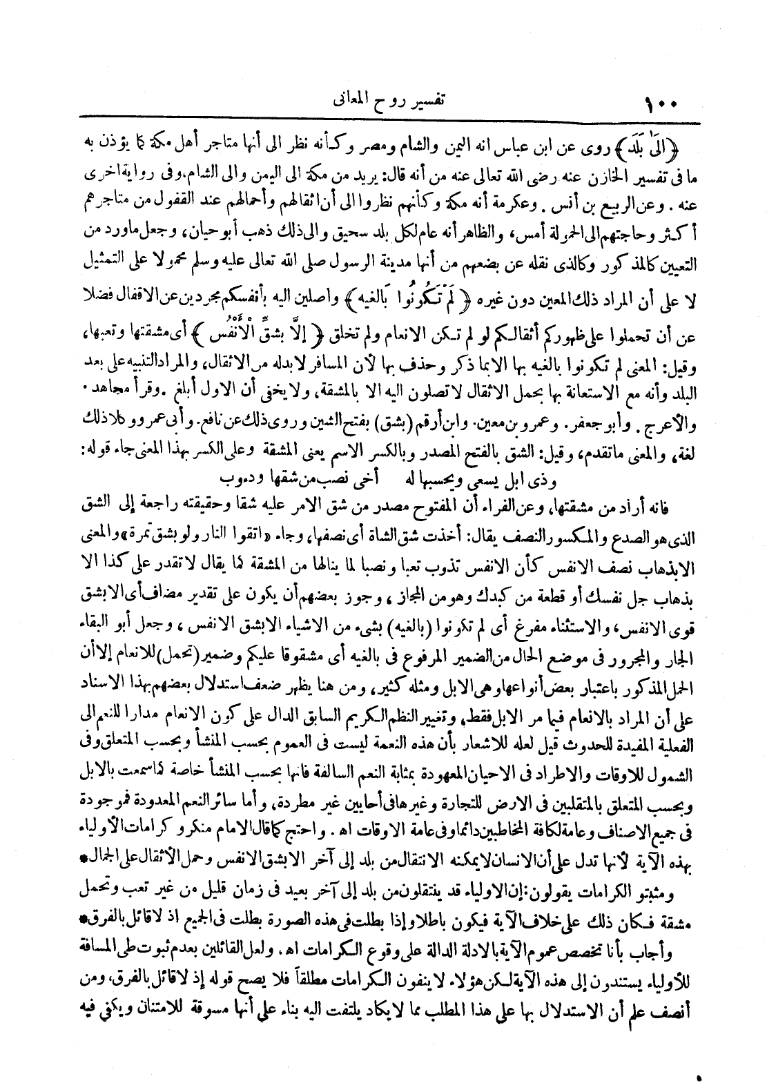 إلى بلد روي عن ابن عباس أنه اليمن والشام ومصر وكأنه نظر إلى أنها متاجر أهل مكة كما يؤذن به ما في تفسير الخازن عنه رضي الله تعالى عنه من أنه قال : يريد من مكة إلى اليمن وإلى الشام وفي رواية أخرى عنه وعن الربيع بن أنس وعكرمة أنه مكة وكأنهم نظروا إلى أن أثقالهم وأحمالهم عند القفول من متاجرهم أكثر وحاجتهم إلى الحمولة أمس والظاهر أنه عام لكل بلد سحيق وإلى ذلك ذهب أبو حيان وجعل ما ورد من التعيين كالمذكور وكالذي نقله عن بعضهم من أنها مدينة الرسول صلى الله تعالى عليه وسلم محمولا على التمثيل لا على أن المراد ذلك المعين دون غيره لم تكونوا بالغيه واصلين إليه بأنفسكم مجردين عن الأقفال فضلا عن أن تحملوا على ظهوركم أثقالكم لو لم تكن الأنعام ولم تخلق إلا بشق الأنفس أي مشتقها وتعبها وقيل : المعنى لم تكونوا بالغيه بها إلا بما ذكر وحذف بها لأن المسافر لا بد له من الأثقال والمراد التنبيه على بعد البلد وأنه مع الإستعانة بها بحمل الأثقال لا تصلون إليه إلا بالمشقة ولا يخفى أن الأول أبلغ وقرأ مجاهد والأعرج وأبو جعفر وعمرو بن معين وابن أرقم بشق بفتح الشين وروي ذلك عن نافع وابن عمرو وكلا ذلك لغة والمعنى ما تقدم وقيل : الشق بالفتح المصدر وبالكسر الاسم يعني المشقة وعلى الكسر بهذا المعنى جاء قوله : وذي إبل يسعى ويحسبها له أخي نصب من شقها ودءوب فإنه أراد مشقتها وعن الفراء أن المفتوح مصدر من شق الأمر عليه شقا وحقيقته راجعة إلى الشق الذي هو الصدع والمكسور النصف يقال : أخذت شق الشاة أي نصفها وجاء اتقوا النار ولو بشق تمرة والمعنى إلا بذهاب نصف الأنفس كأن الأنفس تذوب تعبا ونصبا لما ينالها من المشقة كما يقال لا تقدر على كذا إلا بذهاب جل نفسك أو قطعة من كبدك وهو من المجاز وجوز بعضهم أن يكون على تقدير مضاف أي إلا بشق قوي الأنفس والإستثناء مفرغ أي لم تكونوا بالغيه بشيء من الأشياء إلا بشق الأنفس وجعل أبو البقاء الجار والمجرور في موضع الحال من الضمير المرفوع في بالغيه أي مشقوقا عليكم وضمير تحمل للأنعام إلا أن الحمل المذكور باعتبار بعض أنواعها وهي الإبل ومثله كثير ومن هنا يظهر ضعف استدلال بعضهم بهذا الإسناد على أن المراد بالأنعام فيما مر الإبل فقط وتغيير النظم الكريم السابق الدال على كونه الأنعام مدارا للنعم إلى الفعلية المفيدة للحدوث قيل لعله للإشعار بأن هذه النعمة ليست في العموم بحسب المنشأ وبحسب المتعلق وفي الشمول للأوقات والأطراد في الأحيان المعهودة بمثابة النعم السالفة فإنها بحسب المنشأ خاصة كما سمعت بالإبل وبحسب المتعلق بالمتقلبين في الأرض للتجارة وغيرها في أحايين غير مطردة وأما سائر النعم المعدودة فموجودة في جميع الأصناف وعامة لكافة المخاطبين دائما في عامة الأوقات أه واحتج كما قال الإمام منكر كرامات الأولياء بهذه الآية لأنها تدل على أن الإنسان لا يمكنه الإنتقال من بلد إلى آخر إلا بشق الأنفس وحمل الثقال على الجمال
