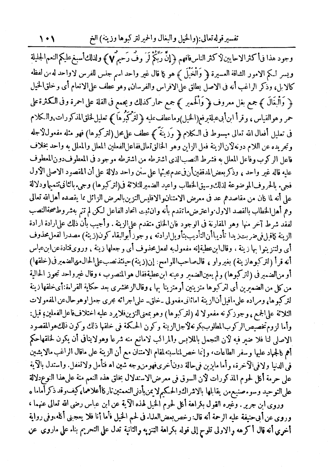 - ولذلك أسبغ عليكم النعم الجليلة ويسر لكم الأمور الشاقة العسيرة والخير هو كما قال غير واحد اسم جنس للفرس لا واحد له من لفظه كالإبل وذكر الراغب أنه في الأصل يطلق على الإفراس والفرسان وهو عطف على الأنعام أي وخلق الخيل والبغال جمع بغل معروف والحمير جمع حمار كذلك ويجمع في القلة على أحمرة وفي الكثرة على حمر وهو القياس وقرأ ابن أبي عبلة برفع الخيل وما عطف عليه لتركبوها تعليل لخلق المذكورات والكلام في تعليل أفعال الله تعالى مبسوط في الكلام وزينة عطف على محل لتركبوها فهو مثله مفعول لأجله وتجريده عن اللام دونه لأن الزينة فعل الزاين وهو الخالق تعالى ففاعل الفعلين المعلل والمعلل به واحد بخلاف فاعل الركوب وفاعل المعلل به فشرط النصب الذي اشترطه من اشترطه موجود في المعطوف دون المعطوف عليه قاله غير واحد وذكر بعض المدققين أن في عدم مجيئها على سنن واحد دلالة على أن المقصود الأصلي الأول فجيء بالحروف الموضوعة لذلك وسيق الخطاب وأعيد الضمير للثلاثة في لتركبوها وجيء بالثاني تتميما ودلالة على أنه لما كان من مقاصدهم عد في معرض الإمتنان وإلا فليس التزين بالعرض الزائل مما يقصده أهل الله تعالى وهم أهل الخطاب بالقصد الأول واعترض ما تقدم بأنه وإن ثبت اتحاد الفاعل لكن لم تتم به شروط صحة النصب لفقد شرط آخر منها وهو المقارنة في الوجود فإن الخلق متقدم على الزينة وأجيب بأن ذلك على إرادة إرادة الزينة كما قيل في ضربت زيدا تأديبا أن التأديب بتأويل إرادته وجوز أبو البقاء كون زينة مصدرا لفعل محذوف أي ولتتزينوا بها زينة وقال ابن عطية إنه مفعول به لفعل محذوف أي وجعلها زينة وروي قتادة عن ابن عباس أنه قرأ لتركبوها زينة بغير واو قال صاحب اللوامح : إن زينة حينئذ نصب على الحال من الضمير في خلقها أو من الضمير في لتركبوها ولم يعين الضمير وعينه ابن عطية فقال هو المنصوب وقال غير واحد تجوز الحالية من كل من الضميرين أي لتركبوها متزينين أو متزينا بها وقال الزمخشري بعد حكاية القراءة : أي خلقها زينة لتركبوها ومراده على ما قيل أن الزينة إما ثاني مفعولي خلق على إجرائه مجرى جعل أو هو حال عن المفعولات الثلاثة على الجميع وجوز كونه مفعولا له لتركبوها وهو بمعنى التزين فلا يرد عليه اختلاف فاعل الفعلين قيل : وأما لزوم تخصيص الركوب المطلوب بكونه لأجل الزينة وكون الحكمة في خلقها ذلك وكون ذلك هو المقصود الأصلي لنا فلا ضير فيه لأن التجمل بالملابس والمراكب لا مانع منه شرعا وهو لا ينافي أن يكون لخلقها حكم أهم كالجهاد عليها وسفر الطاعات وإنما خص لمناسبته لمقام الإمتنان مع أن الزينة على ما قال الراغب ما لا يشين في الدنيا ولا في الآخرة وأما ما يزين في حالة دون أخرى فهو من وجه شين أه فتأمل ولا تغفل واستدل بالآية على حرمة أكل لحوم المذكورات لأن السوق معرض في الإستدلال بخلق هذه النعم منة على هذا النوع دلالة على التوحيد وسوء صنيع من يقابلها بالإشراك والحكيم لا يمن بأدنى النعمتين تاركا أعلاهما كيف وقد ذكر أماما