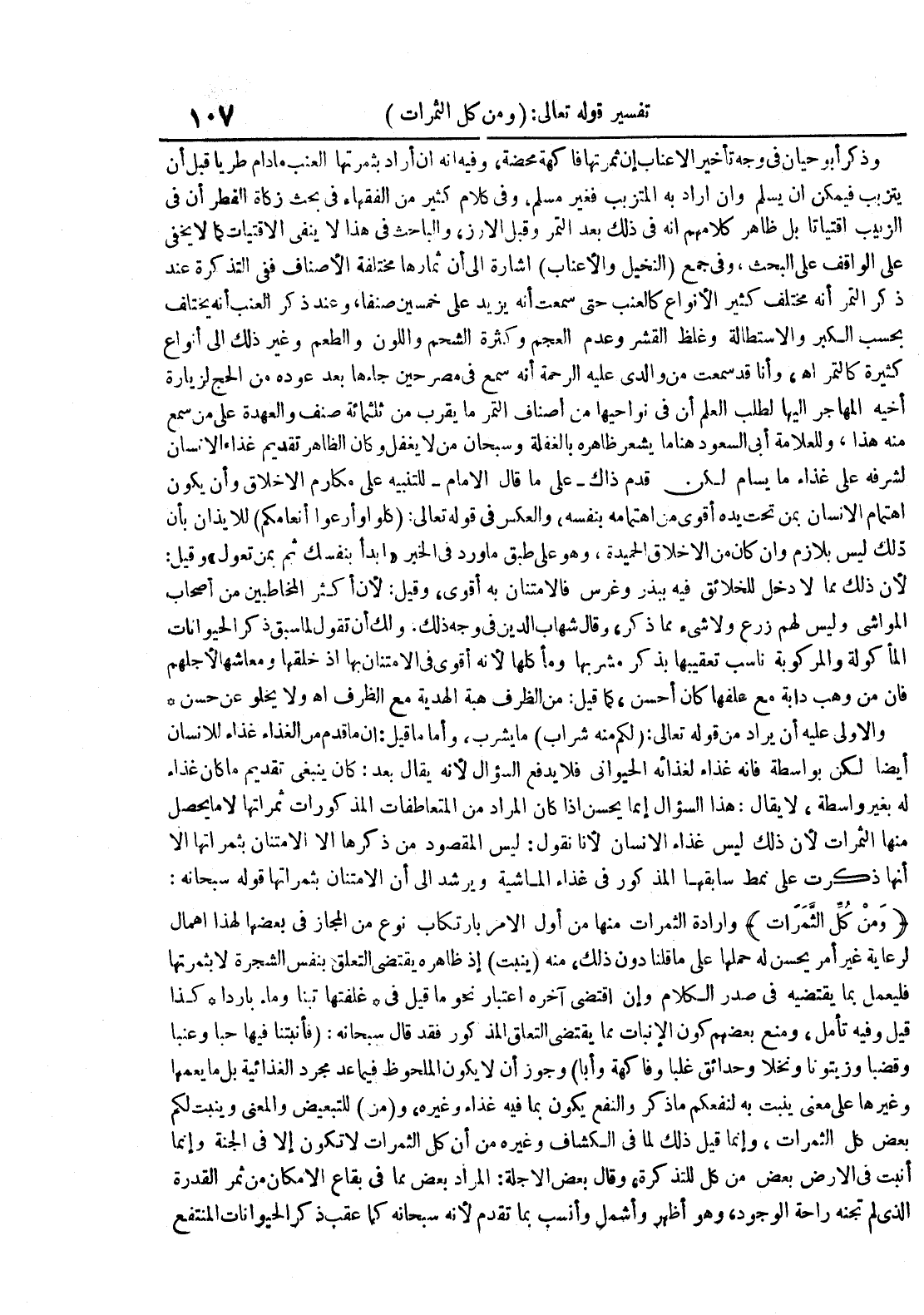 وذكر أبو حيان في وجه تأخير الأعناب إن ثمرتها فاكهة محضة وفيه أنه أراد بثمرتها العنب ما دام طريا قبل أن يتزبب فيمكن أن يسلم وإن أراد به المتزبب فغير مسلم وفي كلام كثير من الفقهاء في بحث زكاة الفطر أن في الزبيب اقياتا بل ظاهر كلامهم أنه في ذلك بعد التمر وقبل الإرز والبحاث في هذا لا ينفي الأقتيات كما لا يخفى على الواقف على البحث وفي جمع النخيل والأعناب إشارة إلى أن ثمارها مختلفة الأصناف ففي التذكرة عند ذكر التمر أنه مختلف كثير الأنواع كالعنب حتى سمعت أنه يزيد على خمسين صنفا وعند ذكر العنب أنه يختلف بحسب الكبر والإستطالة وغلظ القشر وعدم العجم وكثرة الشحم واللون والطعم وغير ذلك إلى أنواع كثيرة كالتمر أه وأنا قد سمعت من والدي عليه الرحمة أنه سمع في مصر حين جاءها بعد عوده من الحج لزيارة أخيه المهاجر إليها لطلب العلم أن في نواحيها من أصناف التمر ما يقرب من ثلثمائة صنف والعهدة على من سمع منه هذا وللعلامة أبي السعود هنا ما يشعر ظاهره بالغفلة وسبحان من لا يغفل وكان الظاهر تقديم غذاء الإنسان لشرفه على غذاء ما يسام لكن قدم ذاك على ما قال الإمام للتنبيه على مكارم الأخلاق وأن يكون اهتمام الإنسان بمن تحت يده أقوى من اهتمامه بنفسه والعكس في قوله تعالى : كلوا وأرعوا أنعامكم للإيذان بأن ذلك ليس بلازم وإن كان من الأخلاق الحميدة وهو على طبق ما ورد في الخبر ابدأ بنفسك ثم بمن تعول وقيل : لأن ذلك مما لا دخل للخلائق فيه ببذر وغرس فالإمتنان به أقوى وقيل : لأن أكثر المخاطبين من أصحاب المواشي لهم زرع ولا شيء مما ذكره وقال شهاب الدين في وجه ذلك ولك أن تقول لما سبق ذكر الحيوانات المأكولة والمركوبة ناسب تعقيبها بذكر مشربها ومأكلها لأنه أقوى في الإمتنان بها إذ خلقها ومعاشها لأجلهم فإن من وهب دابة مع علفها كان أحسن كما قيل : من الظرف هبة الهدية مع الظرف أه ولا يخلو عن حسن