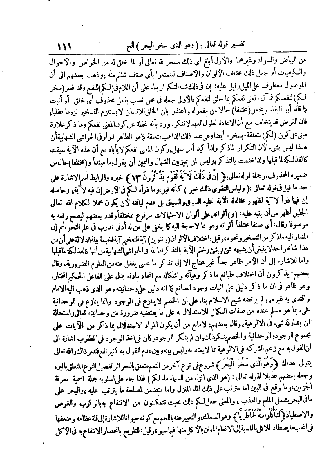 - خبره والرابط اسم الإشارة على حد ما قيل في قوله تعالى : ولباس التقوى ذلك خير كأنه قيل وما ذرأه لكم من الأرض إن فيه لآية وحاصله إن فيما ذرأ لآية لظهور مخالفة الآية عليه السباق والسياق بل عدم لياقته لأن يكون محملا لكلام الله تعالى الجليل أظهر من أن ينبه عليه و ألوانه على ألوان الإحتمالات مرفوع بمختلفا وقدر بعضهم ليصح رفعه به موصوفا وقال : أي صنفا مختلفا ألوانه وهو مما لا حاجة إليه كما يخفى على من له أدنى تدرب في علم النحو ثم إن المشار إليه ما ذكر من التسخير ونحوه وقيل : اختلاف الألوان وتنوين آية للتفخيم آية فخيمة بينة الدلالة على أن من هذا شأنه واحد لا ينبغي أن يشبه شيء في شيء وختم الآية بالتذكر إما لما في الحواشي الشهابية من أنها كالفذلكة لما قبلها وإما للإشارة إلى أن الأمر ظاهر جدا غير محتاج إلى تذكر ما عسى يغفل عنه من العلوم الضرورية وقال بعضهم : يذكرون أن اختلاف طبائع ما ذكر وهيآته وأشكاله مع اتحاد مادته يدل على الفاعل الحكيم المختار وهو ظاهر في أن ما ذكر دليل على إثبات وجود الصانع كما أنه دليل على وحدانيته وهو الذي إليه الإمام واقتدى به غيره ولم يرتضه شيخ الإسلام بناء على أن الخصم لا ينازع في الوجود وإنما ينازع في الوحدانية فجيء بما هو مسلم عنده من صفات الكمال للإستدلال به على ما يقتضيه ضرورة من وحدانيته تعالى واستحالة أن يشاركه شيء في الألوهية وقال بعضهم : لا مانع من أن يكون المراد الإستدلال بما ذكر من الآيات على مجموع الوجود الوحدانية والخصم ينكر ذلك وإن لم ينكر الوجود وكان في أخذ الوجود في المطلوب إشارة إلى أن القول به مع زعم الشركة في الألوهية مما لا يتعد به وليس بينه وبين عدم القول به كثير نفع فتدبر ذاك والله تعالى يتولى هداك وهو الذي سخر البحر شروع في نوع آخر من النعم متعلق بالبحر اثر تفصيل النوع المتعلق بالبر وجعله بعضهم عديلا لقوله تعالى : هو الذي أنزل من السماء ماء لكم فلذا جاء على أسلوبه جملة إسمية معرفة الجزئين وما وقع في البين إما مترتب على ذلك الماء المنزل وإما متضمن لمصلحة ما يترتب عليه والبحر على ما في البحر يشمل الملح والعذب والمعنى جعل لكم ذلك بحيث تتمكنون من الإنتفاع به بالركوب والغوص والإصطياد لتأكلوا منه لحما طريا وهو السمك والتعبير عنه باللحم مع كونه حيوانا للإشارة إلى قلة عظامه وضعفها في أغلب ما يصطاد للأكل بالنسبة إلى الأنعام الممتن بالأكل منها فيما سبق وقيل : للتلويح بانحصار الإنتفاع به في الأكل