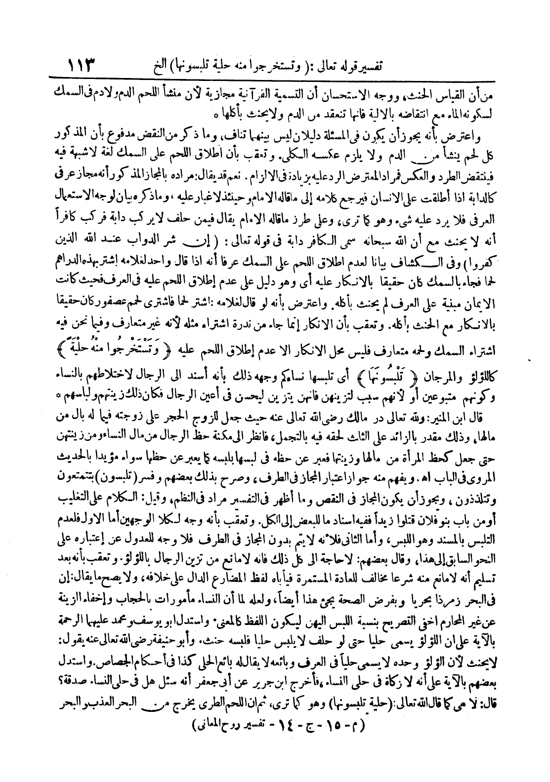 واعترض بأنه يجوز أن يكون في السئلة دليلان ليس بينهما تناف وما ذكر من النقض مدفوع بأن المذكور كل لحم ينشأ من الدم ولا يلزم عكسه الكلبي وتعقب بأن إطلاق اللحم على السمك لغة لا شبهة فيه فينتقض الطرد والعكس فمراد المعترض الرد عليه بزيادة في الإلزام نعم قد يقال : مراده بالمجاز المذكور أنه مجاز عرفي كالدابة إذا أطلقت على الإنسان فيرجع كلامه إلى ما قاله الإمام وحينئذ لا غبار عليه وما ذكره بيان لوجه الإستعمال العرفي فلا يرد عليه شيء وهو كما ترى وعلى طرز ما قاله الإمام يقال فيمن حلف لا يركب دابة فركب كافرا أنه لا يحنث مع أن الله سبحانه سمى الكافر دابة في قوله تعالى : إن شر الدواب عند الله الذين كفروا وفي الكشاف بيانا لعدم إطلاق اللحم على السمك عرفا أنه إذا قال واحدا لغلامه اشتر بهذه الدراهم لحما فجاء بالسمك كان حقيقا بالإنكار عليه أي وهو دليل على عدم إطلاق اللحم عليه في العرف فحيث كانت الإيمان مبنية على العرف لم يحنث بأكله واعترض بأنه لو قال لغلامه : اشتر لحما فاشترى لحم عصفور كان حقيقا بالإنكار مع الحنث بأكله وتعقب بأن الإنكار إنما جاء من ندرة اشتراء مثله لأنه غير متعارف وفيما نحن فيه اشتراء السمك ولحمه متعارف فليس محل الإنكار إلا عدم إطلاق اللحم عليه وتستخرجوا منه حلية كاللؤلؤ والمرجان تلبسونها أي تلبسها نساءكم وجهه ذلك بأنه أسند إلى الرجال لاختلاطهم بالنساء وكونهم متبوعين أو لأنهم سبب لتزينهن فإنهن يتزين ليحسن في أعين الرجال فكان ذلك زينتهم ولباسهم
