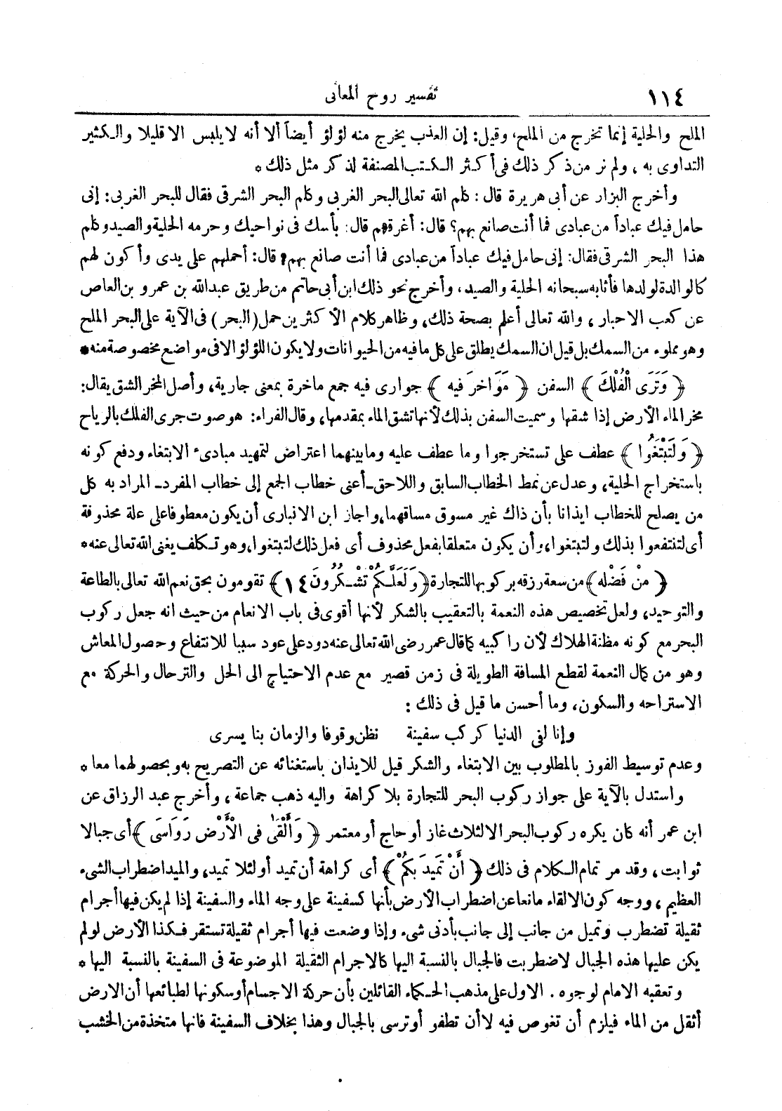 - تقومون بحق نعم الله تعالى بالطاعة والتوحيد ولعل تخصيص هذه النعمة بالتعقيب بالشكر لأنها أقوى في باب الأنعام من حيث أنه جعل ركوب البحر مع كونه مظنة الهلاك لأن راكبيه كما قال عمر رضي الله تعالى عنه دود على عود سببا للإنتفاع وحصول المعاش وهو من كمال النعمة لقطع المسافة الطويلة في زمن قصير مع عدم الإحتياج إلى الحل والترحال والحركة مع الإستراحة والسكون وما أحسن ما قيل في ذلك : وإنا لفي الدنيا كركب سفينة نظن وقوفا والزمان بنا يسري وعدم توسيط الفوز بالمطلوب بين الإبتغاء والشكر قيل للإيذان باستغنائه عن التصريح به وبحصولهما معا