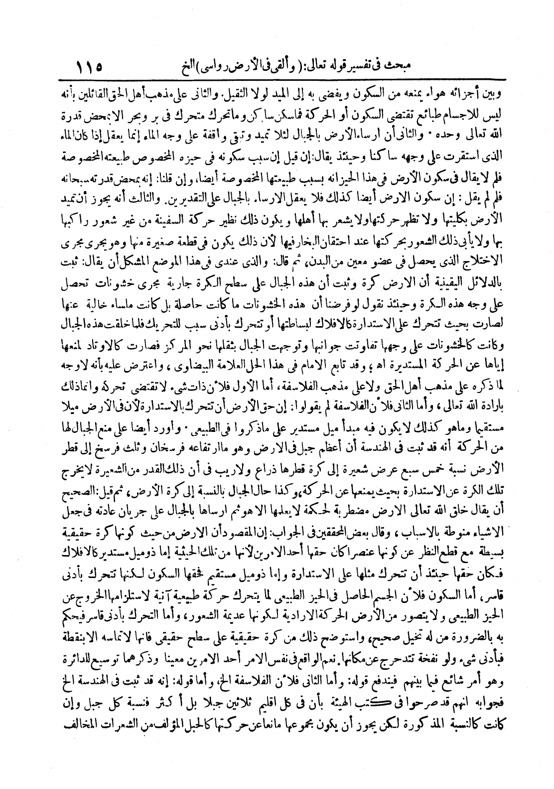 وبين أجزائه هواء يمنعه من السكون ويفضي به إلى الميد لولا الثقيل والثاني على مذهب أهل الحق القائلين بأنه ليس للأجسام طبائع تقتضي السكون أو الحركة فما سكن ساكن وما تحرك متحرك في بر وبحر إلا بمحض قدرة الله تعالى وحده والثاني أن إرساء الأرض بالجبال لئلا تميد وتقي واقفة على وجه الماء إنما يعقل إذا كان الماء الذي استقرت على وجهه ساكنا وحينئذ يقال : إن قيل إن سبب سكونه في حيزه المخصوص طبيعته المخصوصة فلم لا يقال في سكون الأرض في هذا الحيز أنه بسبب طبيعتها المخصوصة أيضا وإن قلنا : إنه بمحض قدرته سبحانه فلم لم يقل : إن سكون الأرض أيضا كذلك فلا يعقل الإرساء بالجبال على التقديرين والثالث أنه يجوز أن تميد الأرض بكليتها ولا تظهر حركتها ولا يشعر بها أهلها ويكون ذلك نظير حركة السفينة من غير شعور راكبها بها ولا يأبى ذلك الشعور بحركتها عند احتقان البخار فيها لأن ذلك يكون في قطعة صغيرة منها وهو يجري مجرى الإختلاج الذي يحصل في عضو معين من البدن ثم قال : والذي عندي في هذا الموضع المشكل أن يقال : ثبت بالدلائل اليقينية أن الأرض كرة وثبت أن هذه الجبال على سطح الكرة جارية مجرى خشونات تحصل على وجه هذه الكرة وحينئذ نقول لو فرضنا أن هذه الخشونات ما كانت حاصلة بل كانت ملساء خالية عنها لصارت بحيث تتحرك على الإستدارة كالفلاك لبساطتها أو تتحرك بأدنى سبب للتحريك فلما خلقت هذه الجبال وكانت كالخشونات على وجهها تفاوتت جوانبها وتوجهت الجبال بثقلها نحو المركز فصارت كالأوتاد لمنعها إياها عن الحركة المستديرة أه وقد تابع الإمام في هذا الحل العلامة البيضاوي واعترض عليه بأنه لا وجه لما ذكره على مذهب أهل الحق ولا على مذهب الفلاسفة أما الأول فلأن ذات شيء لا تقتضي تحركه وإنما ذلك بإرادة الله تعالى وأما الثاني فلأن الفلاسفة لم يقولوا : إن حق الأرض أن تتحرك بالإستدارة لأن في الأرض ميلا مستقيما وما هو كذلك لا يكون فيه مبدأ ميل مستدير على ما ذكروا في الطبيعي وأورد أيضا على منع الجبال لها من الحركة أنه قد ثبت في الهندسة أن أعظم جبل في الأرض وهو ما ارتفاعه فرسخان وثلث فرسخ إلى قطر الأرض نسبة خمس سبع عرض شعيرة إلى كرة قطرها ذراع ولا ريب في أن ذلك القدر من الشعيرة لا يخرج تلك الكرة عن الإستدارة بحيث يمنعها عن الحركة وكذا حال الجبال بالنسبة إلى كرة الأرض ثم قيل : الصحيح أن يقال خلق الله تعالى الأرض مضطربة لحكمة لا يعلمها إلا هو ثم أرساها بالجبال على جريان عادته في جعل الأشياء منوطة بالأسباب وقال بعض المحققين في الجواب : إن المقصود أن الأرض من حيث كونها كرة حقيقية بسيطة مع قطع النظر عن كونها عنصرا كان حقها أحد الأمرين لأنها من تلك الحيثية إما ذو ميل مستدير كالأفلاك فكان حقها حينئذ أن تتحرك مثلها على الإستدارة وإما ذو ميل مستقيم فحقها السكون لكنها تتحرك بأدنى قاسر أما السكون فلأن الجسم الحاصل في الحيز الطبيعي لما يترك حركة طبيعية آنية لاستلزامها الخروج عن الحيز الطبيعي ولا يتصور من الأرض الحركة الإرادية لكونها عديمة الشعور وأما التحرك بأدنى قاسر فيحكم به بالضرورة من له تخيل صحيح واستوضح ذلك من كرة حقيقية على سطح حقيقي فإنها لا تماسه إلا بنقطة فبأدنى شيء ولو نفخة تتدحرج عن مكانها نعم الواقع في نفس الأمر أحد الأمرين معينا وذكرهما توسيع للدائرة وهو أمر شائع فيما بينهم فيندفع قوله : وأما الثاني فلأن الفلاسفة الخ وأما قوله : إنه قد ثبت في الهندسة الخ فجوابه أنهم قد صرحوا في كتب الهيئة بأن في كل إقليم ثلاثين جبلا بل أكثر فنسبة كل جبل وإن كانت كالنسبة المذكورة لكن يجوز أن يكون مجموعها مانعا عن حركتها كالحبل المؤلف من الشعرات المخالف