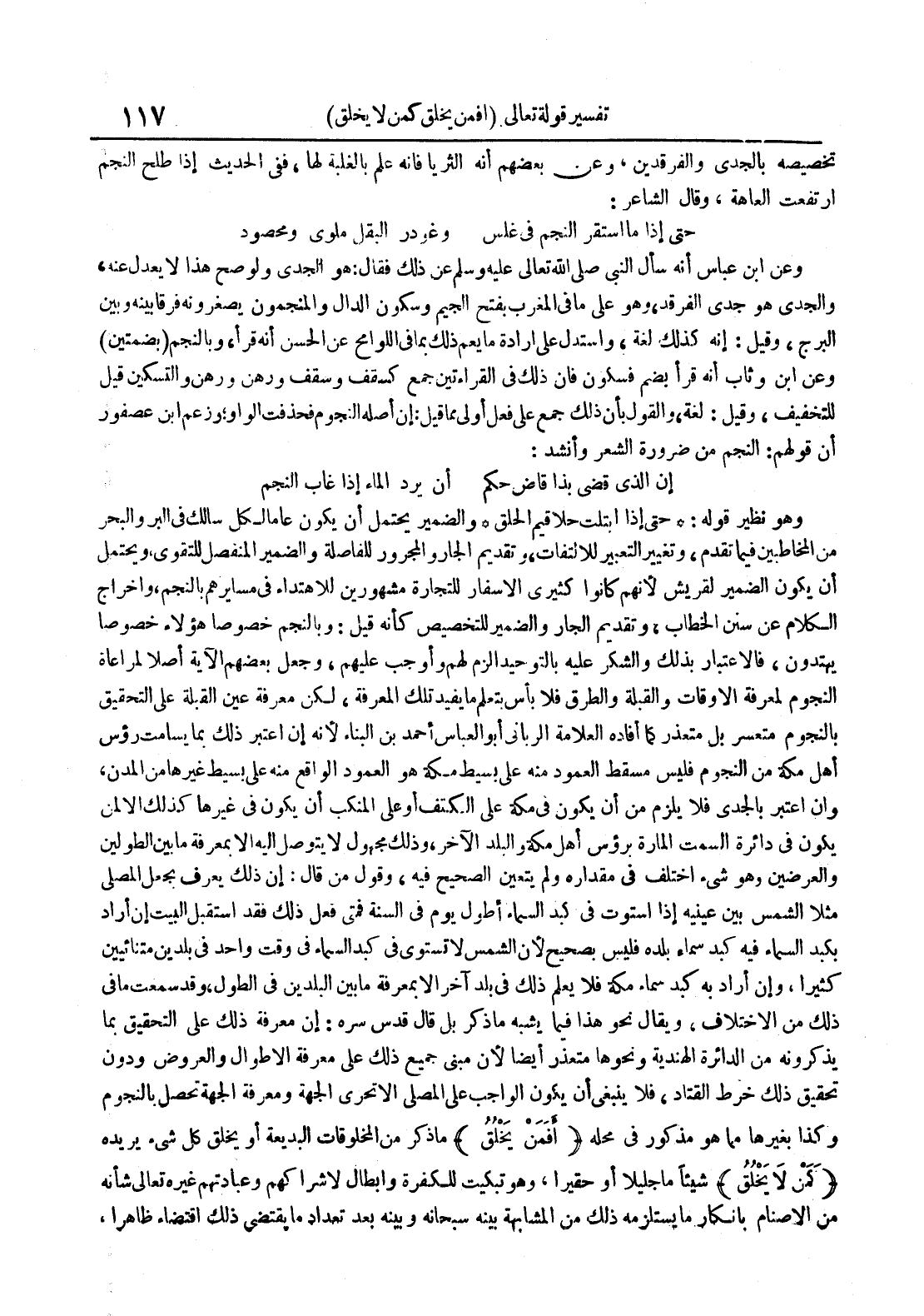 والضمير يحتمل أن يكون عاما لكل سالك في البر والبحر من المخاطبين فيما تقدم وتغيير التعبير للإلتفات وتقديم الجار والمجرور للفاصلة والضمير المنفصل للتقوى ويحتمل أن يكون الضمير لقريش لأنهم كانوا كثيري الأسفار للتجارة مشهورين للإهتداء في مسايرهم بالنجم وأخرج الكلام عن سنن الخطاب وتقديم الجار والضمير والضمير للتخصيص كأنه قيل : وبالنجم خصوصا هؤلاء خصوصا يهتدون فالإعتبار بذلك والشكر عليه بالتوحيد ألزم لهم وأوجب عليهم وجعل بعضهم الآية أصلا لمراعاة النجوم لمعرفة الأوقات والقبلة والطرق فلا بأس بتعلم ما يفيد تلك المعرفة ولكن معرفة عين القبلة على التحقيق بالنجوم متعسر بل متعذر كما أفاده العلامة الرباني أبو العباس أحمد بن البناء لأنه إن اعتبر ذلك بما يسامت رؤس أهل مكة من النجوم فليس مسقط العمود منه على بسيط مكة هو العمود الواقع منه على بسيط غيرها من المدن وإن اعتبر بالجدي فلا يلزم من أن يكون في مكة على الكتف أو على المنكب أن يكون في غيرها كذلك إلا لمن يكون في دائرة السمت المارة برؤس أهل مكة والبلد الآخر وذلك مجهول لا يتوصل إليه إلا بمعرفة ما بين الطولين والعرضين وهو شيء اختلف في مقداره ولم يتعين الصحيح فيه وقول من قال : إن ذلك يعرف بجعل المصلي مثلا الشمس بين عينيه إذا استوت في كبد السماء أطول يوم في السنة فمتى فعل ذلك فقد استقبل البيت إن أراد بكبد السماء فيه كبد سماء بلده فليس بصحيح لأن الشمس لا تستوي في كبد السماء في وقت واحد في بلدين متنائيين كثيرا وإن أراد به كبد سماء مكة فلا يعلم ذلك في بلد آخر إلا بمعرفة ما بين البلدين في الطول وقد سمعت ما في ذلك من الإختلاف ويقال نحو هذا فيما يشبه ما ذكر بل قال قدس سره : إن معرفة ذلك على التحقيق بما يذكرونه من الدائرة الهندية ونحوها متعذر أيضا لأن مبنى جميع ذلك على معرفة الأطوال والعروض ودون تحقيق ذلك خرط القتاد فلا ينبغي أن يكون الواجب على المصلي إلا تحري الجهة ومعرفة الجهة تحصل بالنجوم وكذا بغيرها مما هو مذكور في محله أفمن يخلق ما ذكر من المخلوقات البديعة أو يخلق كل شيء يريده كمن لا يخلق شيئا ما جليلا أو حقيرا وهو تبكيت للكفرة وإبطال لإشراكهم وعبادتهم غيره تعالى شأنه من الأصنام بإنكار ما يستلزمه ذلك من المشابهة بينه سبحانه وبينه بعد تعداد ما يقتضي ذلك اقتضاء ظاهرا