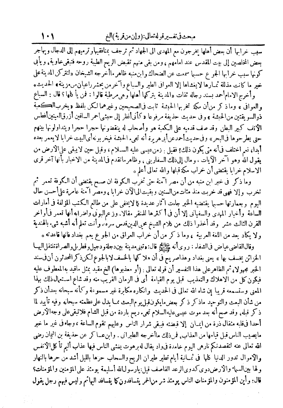موما ذكر في خبر ابن منبه من أن مصر آمنة حتى تخرب الكوفة إن صح يقتضي أن الكوفة تعمر ثم تخرب وإلا فهي قد خربت منذ مئات من السنين وبقيت إلى الآن خرابا ومصر آمنة عامرة على أحسن حال اليوم وبعمارتها حسبما يقتضيه الخبر جاءت آثار عديدة كما لا يخفى على من طالع الكتب المؤلفة في أمارات الساعة وأخبار المهدي والسفياني إلا أن في أكثرها للمنقر مقال وزعم البوني وأضرابه أنها تعمر في أواخر القرن الثالث عشر وقد أخذوا ذلك من كلام الشيخ محيي الدين قدس سره وأنت تعلم أنه أشبه شيء بالهندية ولا يكاد يعد من اللغة العربية وما ذكر من أن خراب العراق من الجوع يعم بغداد فإنها قاعدته