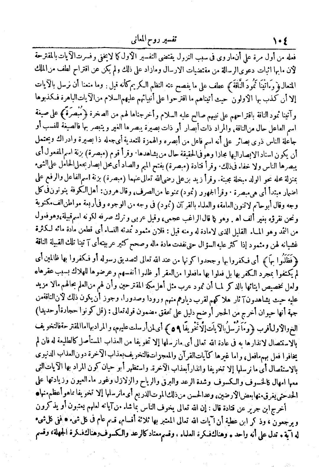 ولعل تخصيص ايتائها بالذكر لما أن ثمود عرب مثل أهل مكة المقترحين وأن لهم من العلم بحالهم ما لا مزيد عليه حيث يشاهدون آثار هلاكهم لقرب ديارهم منهم ورودوا وصدورا وجوز أن يكون ذلك لأن الناقة من جهة أنها حيوان أخرج من الحجر أوضح دليل على تحقق مضمون قوله تعالى : قل كونوا حجارة أو حديدا الخ والأول أقرب وما نرسل بالآيات إلا تخويفا 95 أي لمن أرسلت عليهم والمراد بها إما المقترحة فالتخويف بالاستئصال لانذارها به في عادة الله تعالى أي ما نرسلها إلا تخويفا من العذاب المستأصل كالطليعة له فإن لم يخافوا فعل بهم ما فعل وأما غيرها كآيات القرآن والمعجزات فالتخويف بعذاب الآخرة دون العذاب الدنيوي بالإستئصال أي ما نرسلها إلا تخويفا وإنذارا بعذاب الآخرة واستظهر أبو حيان كون المراد بها الآيات التي معها إمهال كالخسوف والكسوف وشدة الرعد والبرق والرياح والزلازل وغور ماء العيون وزيادتها على الحد حتى يغرق منها بعض الأرضين وعد الحسن من ذلك الموت الذريع أي ما نرسلها إلا تخويفا مما هو أعظم منها