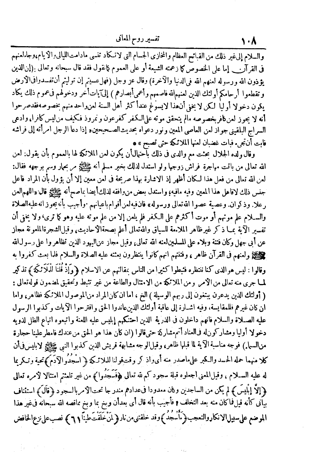 والسلام إلى غير ذلك من القبائح العظام والمخازي الجسام التي لا تكاد تنسى ما دامت الليالي والأيام وجاء لعنهم في القرآن إما على الخصوص كما زعمته الشيعة أو على العموم كما نقول فقد قال سبحانه وتعالى : إن الذين يؤذون الله ورسوله لعنهم الله في الدنيا والآخرة وقال عز و جل فهل عسيتم إن توليتم إلا أن تفسدوا في الأرض أو تقطعوا أرحامكم أولئك الذين لعنهم الله فأصمهم وأعمى أبصارهم إلى آيات أخر ودخولهم في عموم ذلك يكاد يكون دخولا أوليا لكن لا يخفى أن هذا لا يسوغ عند أكثر أهل السنة لعن واحد منهم بخصوصه فقد صرحوا أنه لا يجوز لعن كافر بخصوصه ما لم يتحقق موته على الكفر كفرعون ونمروذ فكيف من ليس كافرا وادعى السراج البلقيني جواز لعن العاصي المعين ونور دعواه بحديث الصحيحين إذا دعا الرجل امرأته إلى فراشه فأبت أن تجيء فبات غضبان لعنها الملائكة حتى تصبح