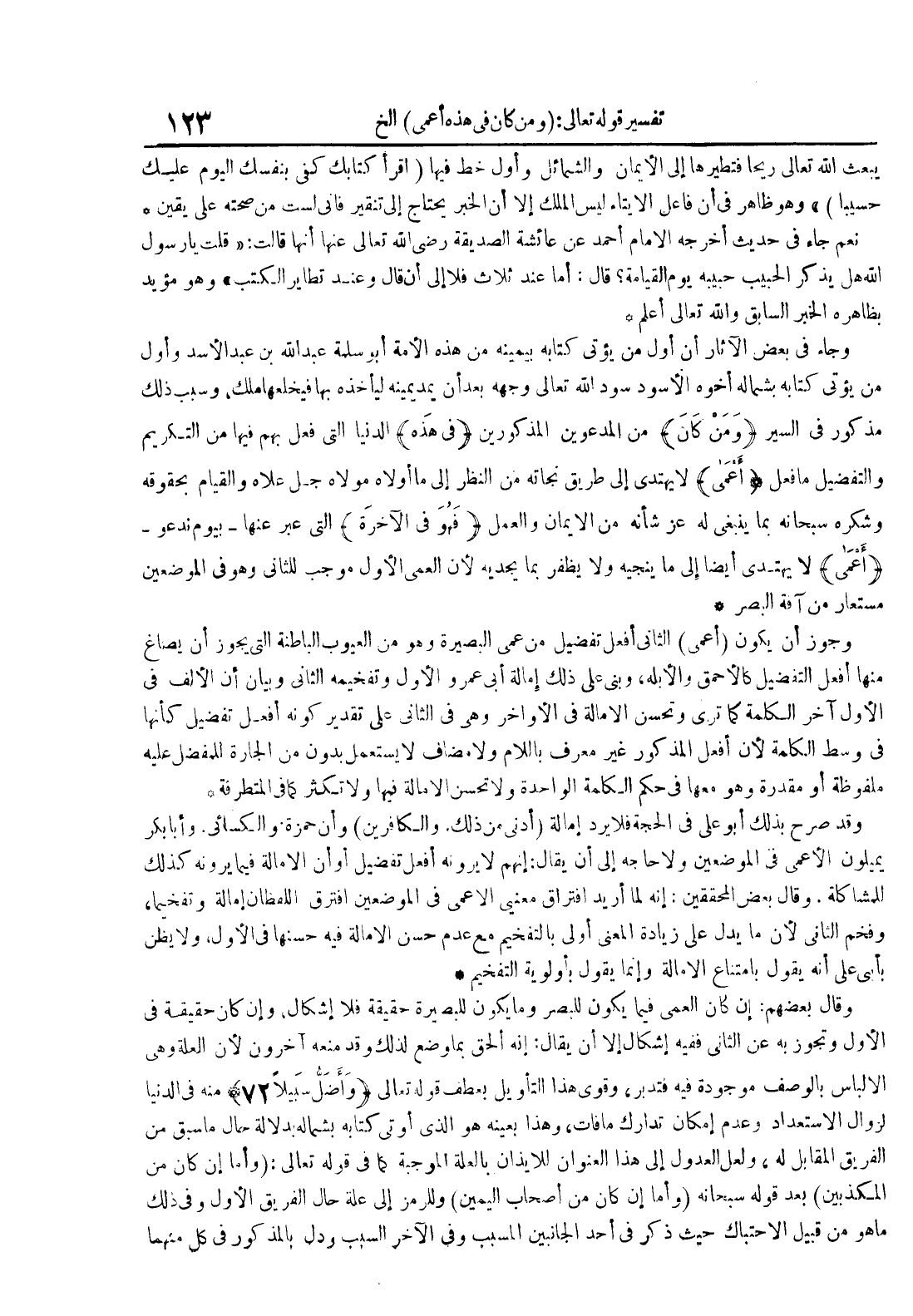 م وجوز أن يكون أعمى الثاني أفعل تفضيل من عمى البصيرة وهو من العيوب الباطنة التي لا يجوز أن يصاغ منها أفعل التفضيل كالأحمق والأبله وبني على ذلك إمالة أبي عمرو الأول وتفخيمه الثاني وبيان أن الألف في الأول آخر الكلمة كما ترى وتحسن الإمالة في الأواخر وهي في الثاني على تقدير كونه أفعل تفضيل كأنها في وسط الكلمة لأن أفعل المذكور باللام ولا مضاف لا يستعمل بدون من الجارة للمفضل عليه ملفوظة أو مقدرة وهو معها في حكم الكلمة الواحدة ولا تحسن الإمالة فيها ولا تكثر كما في المتطرفة