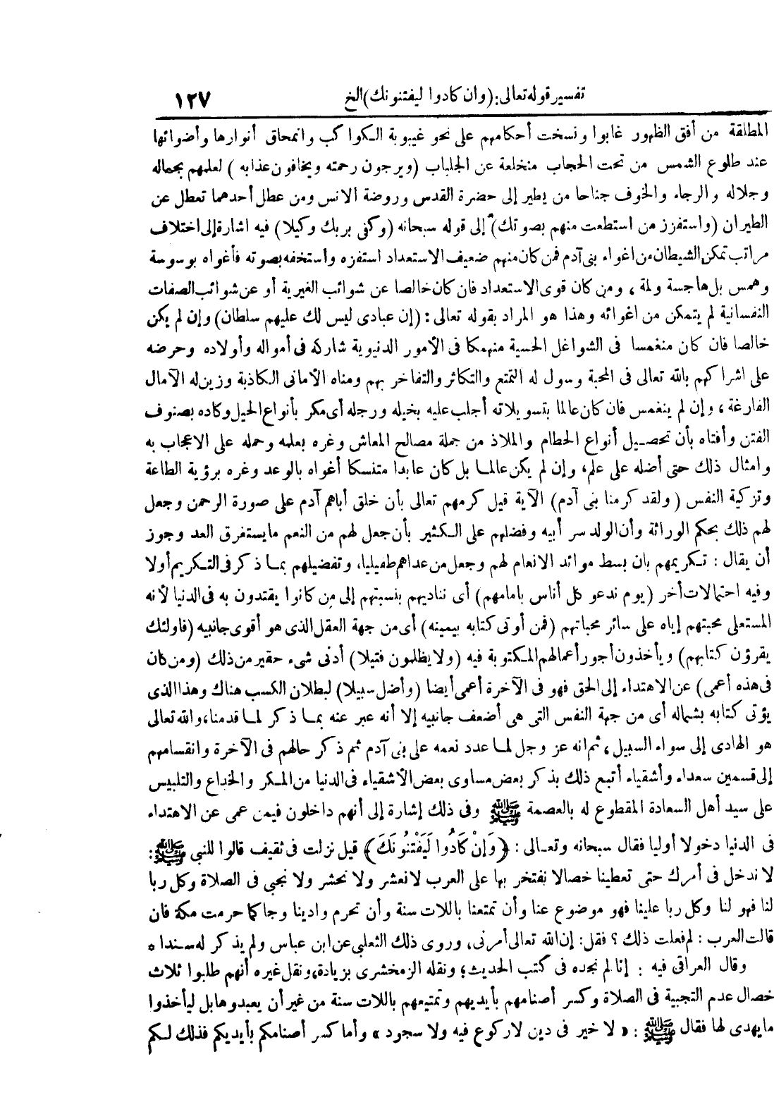 المطلقة من أفق الظهور غابوا ونسخت أحكامهم على نحو غيبوبة الكواكب وانمحاق أنوارها وأضوائها عند طلوع الشمس من تحت الحجاب منخلعة على الجلباب ويرجون رحمته ويخافون عذابه لعلمهم بجماله وجلاله والرجاء والخوف جناحا من يطير إلى حضرة القدس وروضة الأنس ومن عطل أحدهما تعطل عن الطيران واستفزز من استطعت منهم بصوتك إلى قوله سبحانه وكفى بربك وكيلا فيه إشارة إلى اختلاف مراتب تمكن الشيطان من إغواء بني آدم فمن كان منهم ضعيف الاستعداد واستفزه واستخفه بصوته فأغواه بوسوسة وهمس بل هاجسة ولمة ومن كان قوي الاستعداد فإن كان خالصا عن شوائب الغيرية أو عن شوائب الصفات النفسانية لم يتمكن من إغوائه وهذا هو المراد بقوله تعالى : إن عبادي ليس لك عليهم سلطان وإن لم يكن خالصا فإن كان منغمسا في الشواغل الحسية منهمكا في الأمور الدنيوية شاركه في أمواله وأولاده وحرضه على إشراكهم بالله تعالى في المحبة وسول له التمتع والتكاثر والتفاخر بهم ومناه الأماني الكاذبة وزين له الآمال الفارغة وإن لم ينغمس فإن كان عالما بتسويلاته أجلب عليه بخيله ورجله أي مكر بأنواع الحيل وكاده بصنوف الفتن وأفتاه بأن تحصيل أنواع الحطام والملاذ من جملة مصالح المعاش وغره بعلمه وحمله على الإعجاب به وأمثال ذلك حتى أضله على علم وإن لم يكن عالما بل كان عابدا متنسكا أغواه بالوعد وغره برؤية الطاعة وتزكية النفس ولقد كرمنا بني آدم الآية قيل كرمهم تعالى بأن خلق أباهم آدم على صورة الرحمن وجعل لهم ذلك بحكم الوراثة وأن الولد سر أبيه وفضلهم على الكثير بأن جعل لهم من النعم ما يستغرق العد وجوز أن يقال : تكريمهم بأن بسط موائد الأنعام لهم وجعل من عداهم طفيليا وتفضيلهم بما ذكر في التكريم أولا وفيه احتمالات أخر يوم ندعو كل أناس بإمامهم أي نناديهم بنسبتهم إلى من كانوا يقتدون به في الدنيا لأنه المستعلي محبتهم إياه على سائر محباتهم فمن أوتي كتابه بيمينه أي من جهة العقل الذي هو أقوى جانبيه فأولئك يقرؤن كتابهم ويأخذون أجور أعمالهم المكتوبه فيه ولا يظلمون فتيلا أدنى شيء حقير من ذلك ومن كان في هذه أعمى عن الاهتداء إلى الحق فهو في الآخرة أعمى أيضا وأضل سبيلا لبطلان الكسب هناك وهذا الذي يؤتى كتابه بشماله أي من جهة النفس التي هي أضعف جانبيه إلا أنه عبر عنه بما ذكر لما قدمناه والله تعالى هو الهادي إلى سواء السبيل ثم إنه عز و جل لما عدد نعمه على بني آدم ثم ذكر حالهم في الآخرة وانقسامهم إلى قسمين سعداء وأشقياء أتبع ذلك بذكر بعض مساوي بعض الأشقياء في الدنيا من المكر والخداع والتلبيس على سيد أهل السعادة المقطوع له بالعصمة وفي ذلك إشارة إلى أنهم داخلون فيمن عمي عن الاهتداء في الدنيا دخولا أوليا فقال سبحانه وتعالى : وإن كانوا ليفتنونك قيل نزلت في ثقيف قالوا للنبي : لا ندخل في أمرك حتى تعطينا خصالا نفتخر بها على العرب لا نعشر ولا نحشر ولا نجبى في الصلاة وكل ربا لنا فهو لنا وكل ربا علينا فهو موضوع عنا وأن تمتعنا باللات سنة وأن تحرم وادينا وجا كما حرمت مكة فإن قالت العرب : لم فعلت ذلك فقل : إن الله تعالى أمرني وروى ذلك الثعلبي عن ابن عباس ولم يذكر له سندا