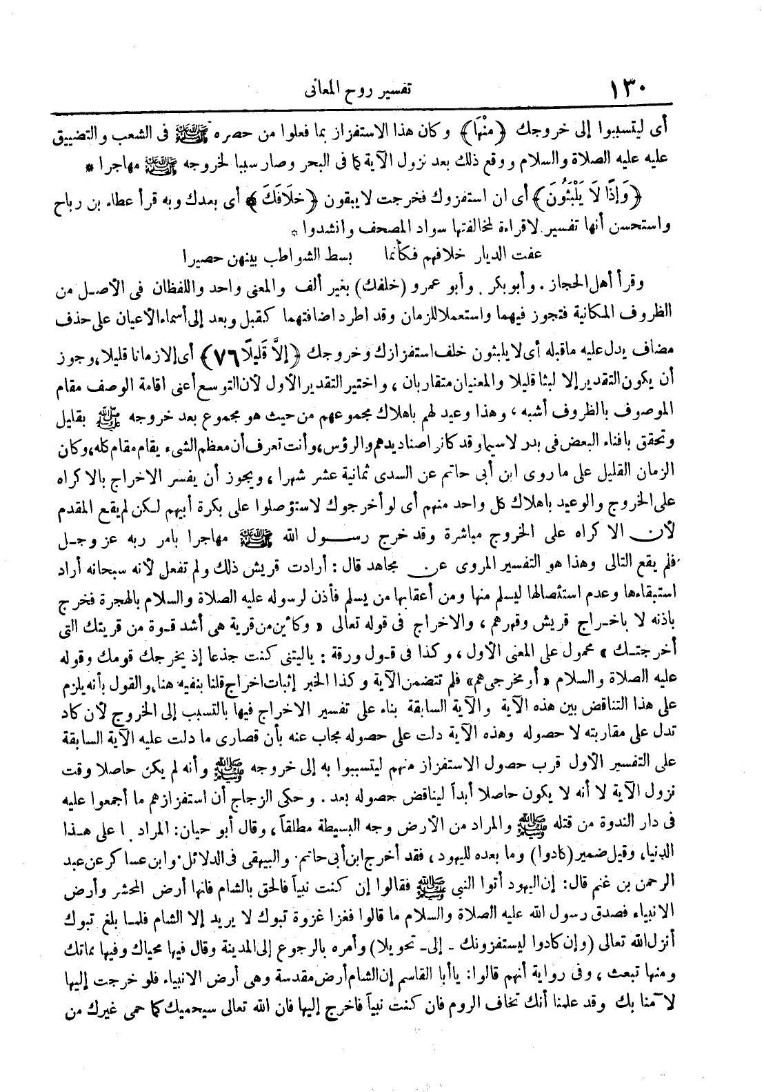 عفت الديار خلافهم فكأنما بسط الشواطب بينهن حصيرا وقرأ أهل الحجاز وأبو بكر وأبو عمرو خلفك بغير ألف والمعنى واحد واللفظان في الأصل من الظروف المكانية فتجوز فيهما واستعملا للزمان وقد أطرد إضافتهما كقبل وبعد إلى أسماء الأعيان على حذف مضاف يدل عليه ما قبله أي لا يلبثون خلف استفزازك وخروجك إلا قليلا 67 أي إلا زمانا قليلا وجوز أن يكون التقدير إلا لبثا قليلا والمعنيان متقاربان واختير التقدير الأول لأن التوسع أعنى إقامة الوصف مقام الموصوف في بالظروف أشبه وهذا وعيد لهم بإهلاك مجموعهم من حيث هو مجموع بعد خروجه بقليل وتحقق بإفناء البعض في بدر لا سيما وقد كانوا صناديدهم والرؤس وأنت تعرف أن معظم الشيء يقام مقام كله وكان الزمان القليل على ما روى ابن أبي حاتم عن السدي ثمانية عشر شهرا ويجوز أن يفسر الإخراج بالإكراه على الخروج والوعيد بإهلاك كل واحد منهم أي لو أخرجوك لاستؤصلوا على بكرة أبيهم لكن لم يقع المقدم لأن الاكراه على الخروج مباشرة وقد خرج رسول الله مهاجرا بأمر ربه عز و جل فلم يقع التالي وهذا هو التفسير المروي عن مجاهد قال : أرادت قريش ذلك ولم تفعل لأنه سبحانه أراد استبقاءها وعدم استئصالها ليسلم منها ومن أعقابها من يسلم فأذن لرسوله عليه الصلاة و السلام بالهجرة فخرج بإذنه لا بإخراج قريش وقهرهم و الاخراج في قوله تعالى وكأين من قرية هي أشد قوة من قريتك التي أخرجتك محمول على المعنى الأول وكذا في قول ورقة : ياليتني كنت جذعا إذيخرجك قومك وقوله عليه الصلاة و السلامأو مخرجي هم فلم تتضمن الآية وكذا الخبر إثبات إخراج قلنا بنفيه هنا والقول بأنه يلزم على هذا التناقض بين هذه الآية والآية السابقة بناء على تفسير الإخراج فيها بالتسبب إلى الخروج لأن كاد تدل على مقاربته لا حصوله وهذه الآية دلت على حصوله مجاب عنه بأن قصارى ما دلت عليه الآية السابقة على التفسير الأول قرب حصول الاستفزاز منهم ليتسببوا به إلى خروجه وأنه إن لم يكن حاصلا وقت نزول الآية لا أنه لا يكون حاصلا أبدا ليناقض حصوله بعد وحكى الزجاج أن استفزازهم ما أجمعوا عليه في دار الندوة من قتله والمراد من الأرض وجه البسيطة مطلقا وقال أبو حيان : المراد ما على هذا الدنيا وقيل ضمير كادوا وما بعده لليهود فقد أخرج ابن أبي حاتم والبيهقي في الدلائل وابن عساكر عن عبد الرحمن بن غنم قال : إن اليهود أتوا النبي فقالوا إن كنت نبيا فالحق بالشام فإنها أرض المحشر وأرض الأنبياء فصدق رسول الله عليه الصلاة و السلام ما قالوا فغزا غزوة تبوك لا يريد إلا الشام فلما بلغ تبوك أنزل الله تعالى وإن كادوا ليستفزونك إلى تحويلا وأمره بالرجوع إلى المدينة وقال فيها محياك وفيها مماتك ومنها تبعث وفي رواية أنهم قالوا : يا أبا القاسم إن الشام أرض مقدسة وهي أرض الأنبياء فلو خرجت إليها لآمنا بك وقد علمنا أنك تخاف الروم فإن كنت نبيا فاخرج إليها فإن الله تعالى سيحميك كما حمى غيرك من