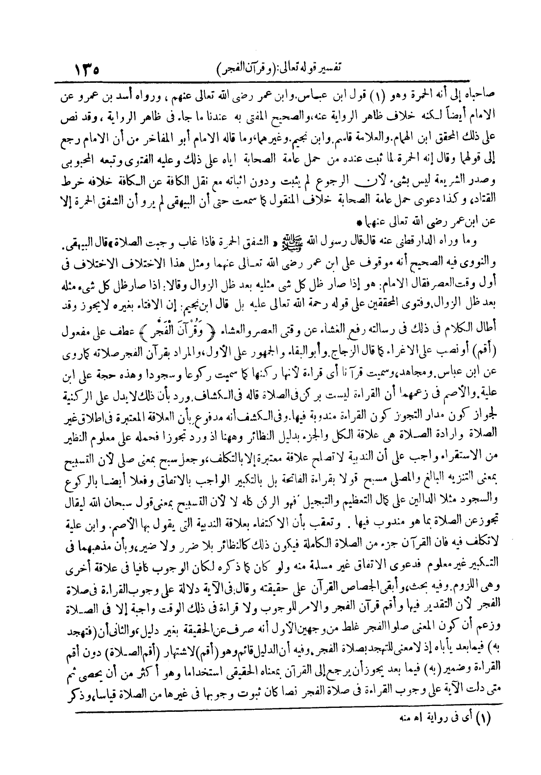 وما رواه الدارقطني عنه قال قال رسول الله الشفق الحمرة فإذا غاب وجبت الصلاة قال البيهقي والنووي فيه الصحيح أنه موقوف عن ابن عمر رضي الله تعالى عنهما ومثل هذا الاختلاف الاختلاف في أول وقت العصر فقال الإمام : هو إذا صار ظل كل شي مثليه بعد ظل الزوال وقالا : إذا صار ظل كل شيء مثله بعد ظل الزوال وفتوى المحققين على قوله رحمة الله تعالى عليه بل قال ابن نجيم : إن الإفتاء بغيره لا يجوز وقد أطال الكلام في ذلك في رسالته رفع الغشاء عن وقتي العصر والعشاء وقرآن الفجر عطف على مفعول أقم أو نصب على الاغراء كما قال الزجاج وأبو البقاء والجمهور على الأول والمراد بقرآن الفجر صلاته كما روي عن ابن عباس ومجاهد وسميت قرآنا أي قراءة لأنها ركنها كما سميت ركوعا وسجودا وهذه حجة على ابن علية والأضم في زعمهما أن القراءة ليست بركن في الصلاة قاله في الكشاف ورد بأن ذلك لا يدل على الركنية لجواز كون مدار التجوز كون القراءة مندوبة فيها وفي الكشف أنه مدفوع بأن العلاقة المعتبرة في إطلاق غير الصلاة وإرادة الصلاة هي علاقة الكل والجزء بدليل النظائر وههنا إذا ورد وتجوزا فحمله على معلوم النظير من الاستقراء واجب على أن الندبية لا تصلح علاقة معتبرة إلا بالتكلف وجعل سبح بمعنى صلى لأن التسبيح بمعنى التنزيه البالغ والمصلي مسبح قولا بقراءة الفاتحة بل في التكبير الواجب بالاتفاق وفعلا أيضا بالركوع والسجود مثلا الدالين على كمال التعظيم والتبجيل فهو الركن كله لا لأن التسبيح بمعنى قول سبحان الله ليقال تجوز عن الصلاة بما هو مندوب فيها وتعقب بأن الاكتفاء بعلاقة الندبية التي يقول بها الأصم وابن علية لا تكلف فيه فإن القرآن جزء من الصلاة الكاملة فيكون ذلك كالنظائر بلا ضرر ولا ضير وبأن مذهبهما في التكبير غير معلوم فدعوى الاتفاق غير مسلمة منه ولو كان كما ذكره لكان الوجوب كافيا في علاقة أخرى وهي اللزوم وفيه بحث وأبقى الجصاص القرآن على حقيقته وقال : في الآية دلالة على وجوب القراءة في صلاة الفجر لأن التقدير فيها وأقم قرآن الفجر والأمر للوجوب ولا قراءة في ذلك الوقت واجبة إلا في الصلاة وزعم أن كون المعنى صلوا الفجر غلط من وجهين الأول أنه صرف عن الحقيقة بغير دليل والثاني أن فتهجد به فيما بعد يأباه إذ لا معنى للتهجد لصلاة الفجر وفيه أن الدليل قائم وهو أقم لاشتهار أقم الصلاة دون أقم القراءة وضمير به فيما بعد يجوز أن يرجع إلى القرآن بمعناه الحقيقي استخداما وهو أكثر من أن يحصى ثم متى دلت الآية على وجوب القراءة في صلاة الفجر نصا كان ثبوت وجوبها في غيرها من الصلاة قياسا وذكر