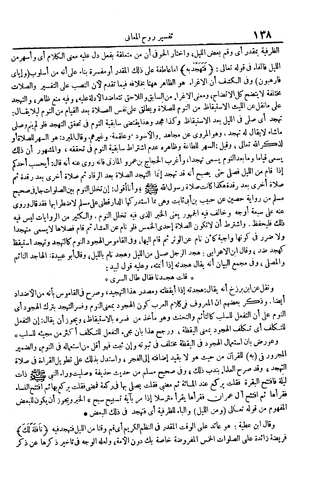 الظرفية بمقدر أي وقم بعض الليل واختار الحوفي أن من متعلقة بفعل دل عليه الكلام أي واسهر من الليل فالفاء في قوله تعالى : فتهجد به إما عاطفة على ذلك المقدر أو مفسرة بناء على أنه من أسلوب وإياي فارهبون وفي الكشف أن الإغراء هو الظاهر ههنا بخلافه فيما تقدم لأن النصب على التفسير والصلات مختلفة لا يتضح كل الإتضاح ومعنى الإغراء من السابق اللاحق وتتعاضد الأدلة عليه وفيه منع ظاهر والتهجد على ما نقل عن الليث الاستيقاظ من النوم للصلاة ويطلق على نفس الصلاة بعد القيام من النوم ليلا يقال : تهجد أي صلى في الليل بعد الاستيقاظ وكذا هجد وهذا يقتضي سابقية النوم في تحقق التهجد فلو لم ينم ويصلي وصلى ما شاء لا يقال له تهجد وهو المروي عن مجاهد والأسود وعلقمة وغيرهم وقال المبرد : هو السهر للصلاة أو لذكر الله تعالى وقيل : السهر للطاعة وظاهره عدم اشتراط سابقية النوم في تحققه والمشهور أن ذلك يسمى قياما وما بعد النوم يسمى تهجدا وأغرب الحجاج بن عمرو المازني فإنه روي عنه أنه قال : أيحسب أحدكم إذا قام من الليل فصلى حتى يصبح أنه قد تهجد إنما التهجد الصلاة بعد الرقاد ثم صلاة أخرى بعد رقدة ثم صلاة أخرى بعد رقدة هكذا كانت صلاة رسول الله وأنا أقول : إن تخلل النوم بين الصلوات جاء في صحيح مسلم من رواية حصين عن حبيب بن أبي ثابت وهي مما استدركها الدارقطني عن مسلم لاضطرابها فقد قال وروى عنه علي سبعة أوجه وخالف فيه الجمهور يعني الخبر الذي تخلل فيه النوم والكثير من الروايات ليس فيه ذلك فليحفظ واشترط أن لا تكون الصلاة إحدى الخمس فلو نام عن العشاء ثم قام فصلاها لا يسمى متهجدا ولا ضرر في كونها واجبة كأن نام غن الوتر ثم قام إليها وفي القاموس الهجود النوم كالتهجد وتهجد واستيقظ كهجد ضد وقال ابن الأعرابي : هجد الرجل صلى من الليل وهجد نام بالليل وقال أبو عبيدة : الهاجد النائم والمصلي وفي مجمع البيان أنه يقال هجدته إذا أنمته وعليه قول لبيد :