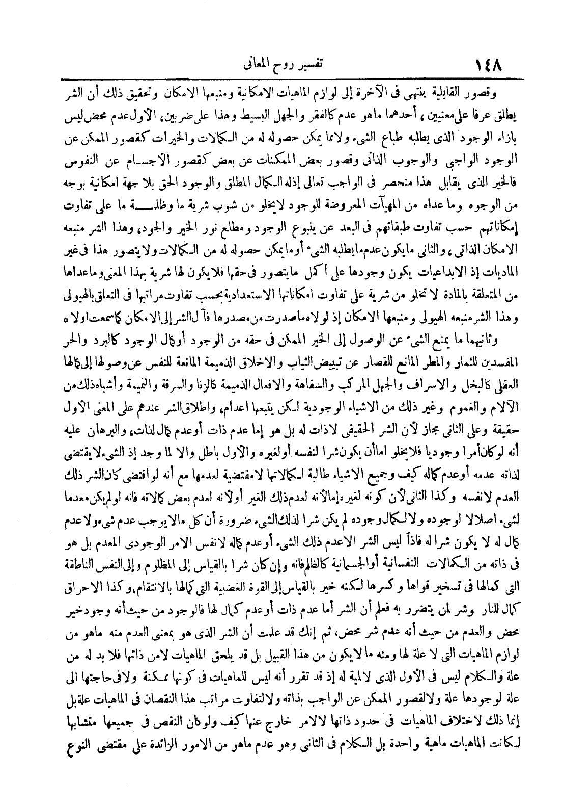 وقصور القابلية ينتهي في الآخرة إلى لوازم الماهيات الإمكانية ومنبعها الإمكان وتحقيق ذلك أن الشر يطلق عرفا على معنيين أحدهما ما هو عدم كالفقر والجهل البسيط وهذا على ضربين الأول عدم محض ليس بأزاء الوجود الذي يطلبه طباع الشيء ولا مما يمكن حصوله له من الكمالات والخيرات كقصور الممكن عن الوجود الواجبي والوجوب الذاتي وقصور بعض الممكنات عن بعض كقصور الأجسام عن النفوس فالخير الذي يقابل هذا منحصر في الواجب تعالى إذ له الكمال المطلق والوجود الحق بلا جهة إمكانية بوجه من الوجوه وما عداه من المهيآت المعروضة للوجود لا يخلو من شوب شرية ما وظلمة ما على تفاوت إمكاناتهم حسب تفاوت طبقاتهم في البعد عن ينبوع الوجود ومطلع نور الخير والجود وهذا الشر منبعه الإمكان الذاتي والثاني ما يكون عدم ما يطلبه الشيء أو ما يمكن حصوله له من الكمالات ولا يتصور هذا في غير الماديات إذ الإبداعيات يكون وجودها على أكمل ما يتصور في حقها فلا يكون لها شرية بهذا المعنى وما عداها من المتعلقة بالمادة لا تخلو من شرية على تفاوت إمكاناتها الاستعدادية بحسب تفاوت مراتبها في التعلق بالهيولي وهذا الشر منبعه الهيولي ومنبعها الإمكان إذ لولاه ما صدرت من مصدرها فآل الشر إلى الإمكان كما سمعت أولا