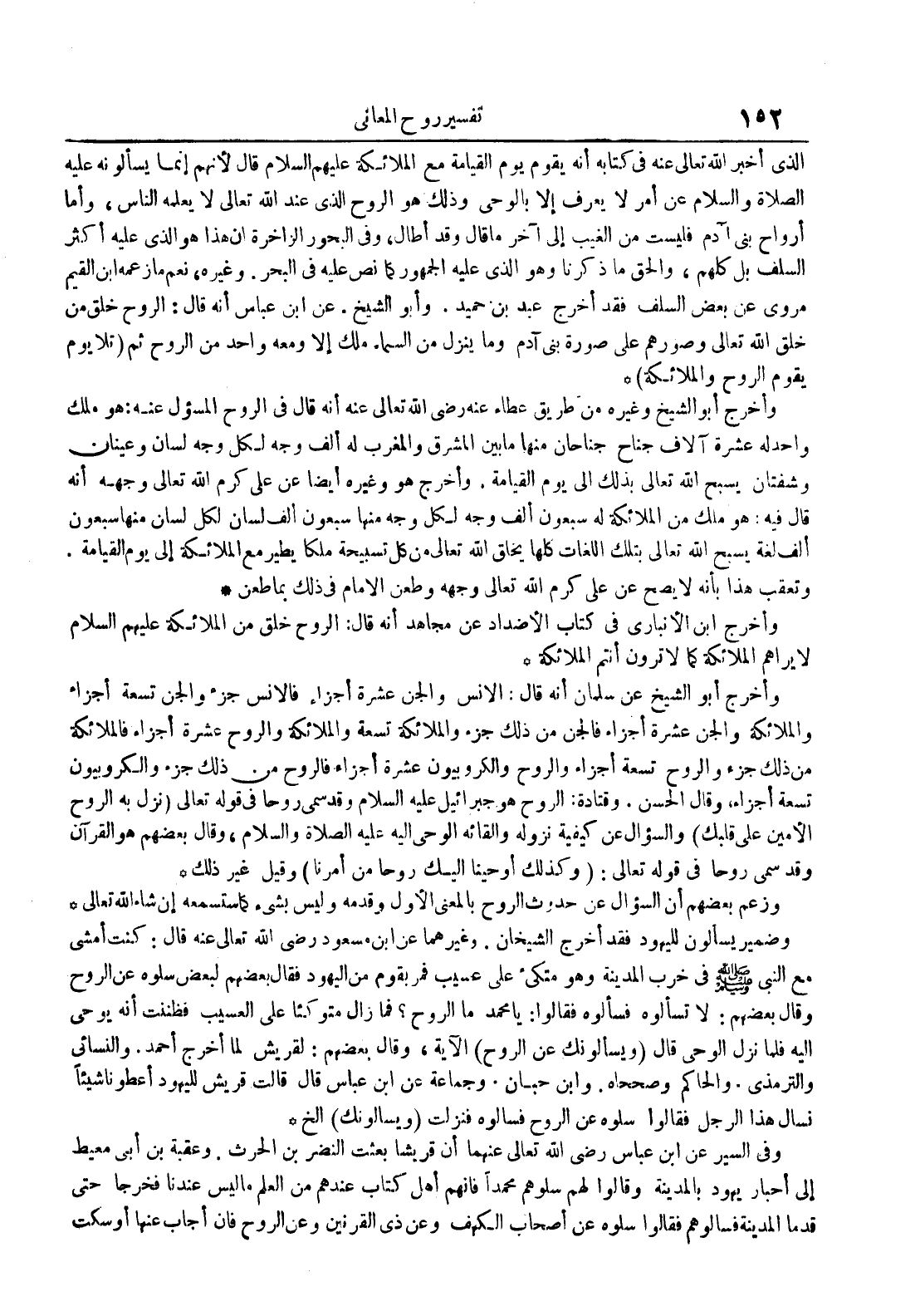 وأخرج أبو الشيخ وغيره من طريق عطاء عنه رضي الله تعالى عنه أنه قال في الروح المسؤل عنه : هو ملك واحد له عشرة آلاف جناح جناحان منها ما بين المشرق والمغرب له ألف وجه لكل وجه لسان وعينان وشفتان يسبح الله تعالى بذلك إلى يوم القيامة وأخرج هو وغيره أيضا عن علي كرم الله تعالى وجهه أنه قال فيه : هو ملك من الملائكة له سبعون ألف وجه لكل وجه منها سبعون ألف لسان لكل لسان منها سبعون ألف لغة يسبح الله تعالى بتلك اللغات كلها يخلق الله تعالى من كل تسبيحة ملكا يطير مع الملائمة إلى يوم القيامة وتعقب هذا بأنه لا يصح عن علي كرم الله تعالى وجهه وطعن الإمام في ذلك بما طعن