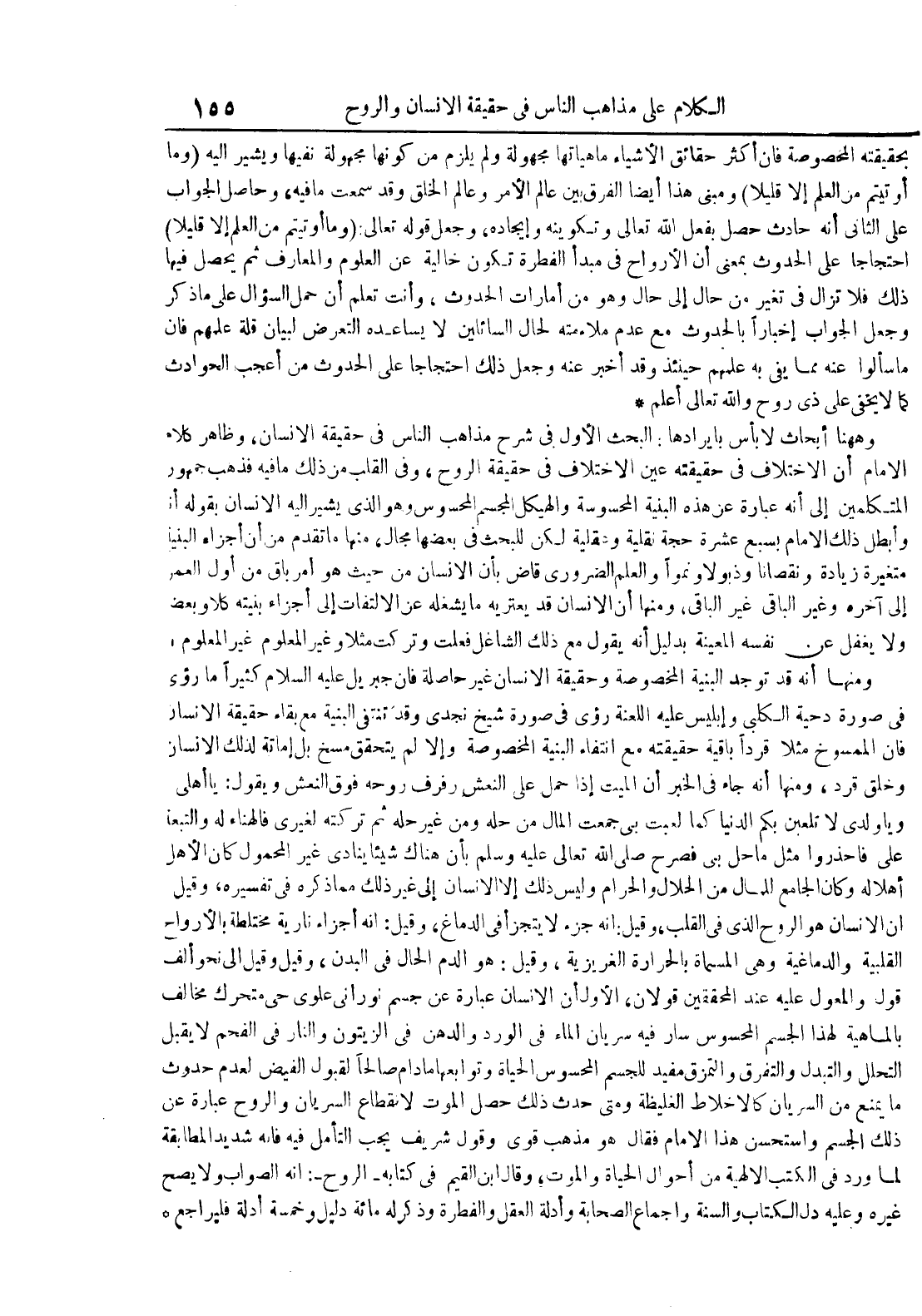 وههنا أبحاث لا بأس بإيرادها : البحث الأول في شرح مذاهب الناس في حقيقة الإنسان وظاهر كلام الإمام أن الاختلاف في حقيقته غير الاختلاف في حقيقة الروح وفي القلب من ذلك ما فيه فذهب جمهور المتكلمين إلى أنه عبارة عن هذه البنية المحسوسة والهيكل المجسم المحسوس وهو الذي يشير إليه بقوله أنا وأبطل ذلك الإمام بسبع عشرة حجة نقلية وعقلية لكن للبحث في بعضها مجال منها ما تقدم من أن أجزاء البنية متغيرة زيادة ونقصانا وذبولا ونموا والعلم الضروري قاض بأن الإنسان من حيث هو أمر باق من أول العمر إلى آخره وغير الباقي غير الباقي ومنها أن الإنسان قد يعتريه ما يشغله عن الإلتفات إلى أجزاء بنيته كلا وبعضا ولا يغفل عن نفسه المعينة بدليل أنه يقول مع ذلك الشاغل فعلت وتركت مثلا وغير المعلوم غير المعلوم