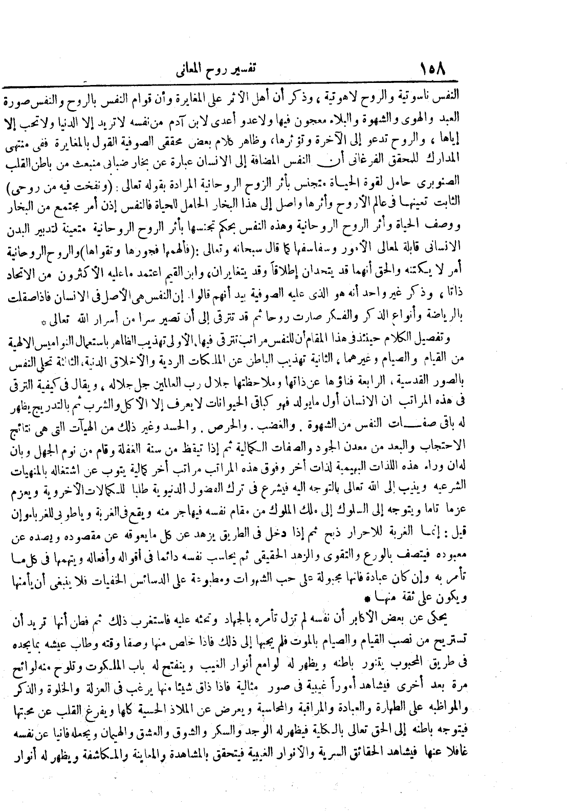 النفس ناسوتية والروح لاهوتية وذكر أن أهل الأثر على المغايرة وأن قوام النفس بالروح والنفس صورة العبد والهوى والشهوة والبلاء معجون فيها ولا عدو أعدى لابن آدم من نفسه لا تريد إلا الدنيا ولا تحب إلا إياها والروح تدعو إلى الآخرة وتؤثرها وظاهر كلام بعض محققي الصوفية القول بالمغايرة ففي منتهى المدارك للمحقق الفرغاني أن النفس المضافة إلى الإنسان عبارة عن بخار ضبابي منبعث من باطن القلب الصنوبري حامل لقوة الحياة متجانس بأثر الروح الروحانية المرادة بقوله تعالى : ونفخت فيه من روحي الثابت تعينها في عالم الأروح وأثرها وأصل إلى هذا البخار الحامل للحياة فالنفس إذا أمر مجتمع من البخار ووصف الحياة وأثر الروح الروحانية وهذه النفس يحكم تجنسها بأثر الروح الروحانية متعينة لتدبير البدن الإنساني قابلة لمعالي الأمور وسفاسفها كما قال سبحانه وتعالى : فألهمها فجورها وتقواها والروح الروحانية أمر لا يكتنه والحق أنهما قد يتحدان إطلاقا وقد يتغيران وابن القيم اعتمد ما عليه الأكثرون من الاتحاد ذاتا وذكر غير واحد أنه هو الذي عليه الصوفية بيد أنهم قالوا إن النفس هي الأصل في الإنسان فإذا صقلت بالرياضة وأنواع الذكر والفكر صارت روحا ثم قد تترقى إلى أن تصير سرا من أسرار الله تعالى