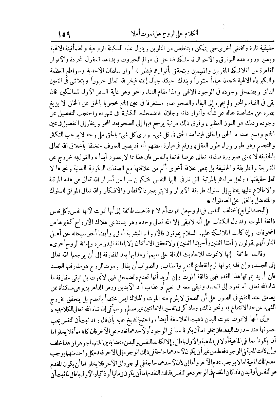 البحث الرابع : اختلف الناس في الروح هل تموت أم لا فذهبت طائفة إلى أنها تموت لأنها نفس وكل نفس ذائقة الموت وقد دل الكتاب على أنه لا يبقى إلا الله تعالى وحده وهو يستدعي هلاك الأرواح كغيرها من المخلوقات وإذا كانت الملائكة عليهم السلام يموتون فالأرواح البشرية أولى وأيضا أخبر سبحانه عن أهل النار أنهم يقولون أمتنا اثنتين وأحييتنا اثنتين ولا تحقق الإماتتان إلا بإماتة البدن مرة وإماتة الروح أخرى