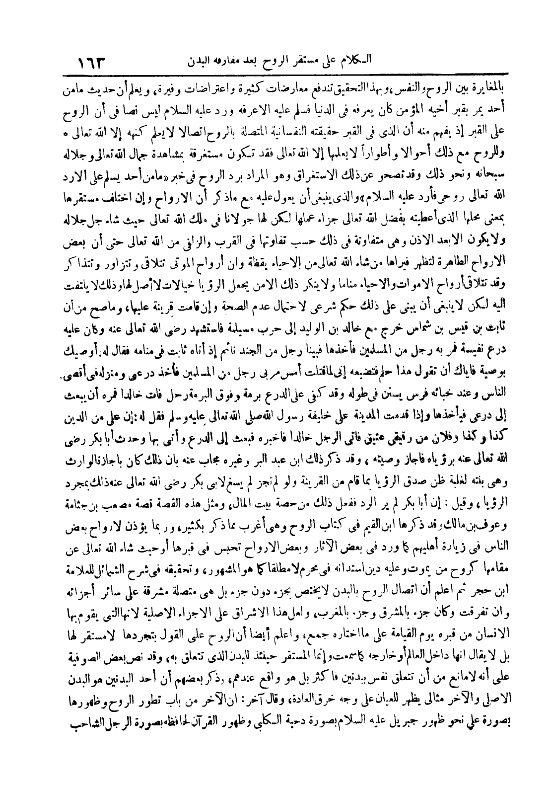 بالمغايرة بين الروح والنفس وبهذا التحقيق تندفع معارضات كثيرة واعتراضات وفيرة ويعلم أن حديث ما من أحد يمر بقبر أخيه المؤمن كان يعرفه في الدنيا فسلم عليه إلا عرفه ورد عليه السلام ليس نصا في أن الروح على القبر إذ يفهم منه أن الذي في القبر حقيقته النفسانية المتصلة بالروح اتصالا لا يعلم كنهه إلا الله تعالى