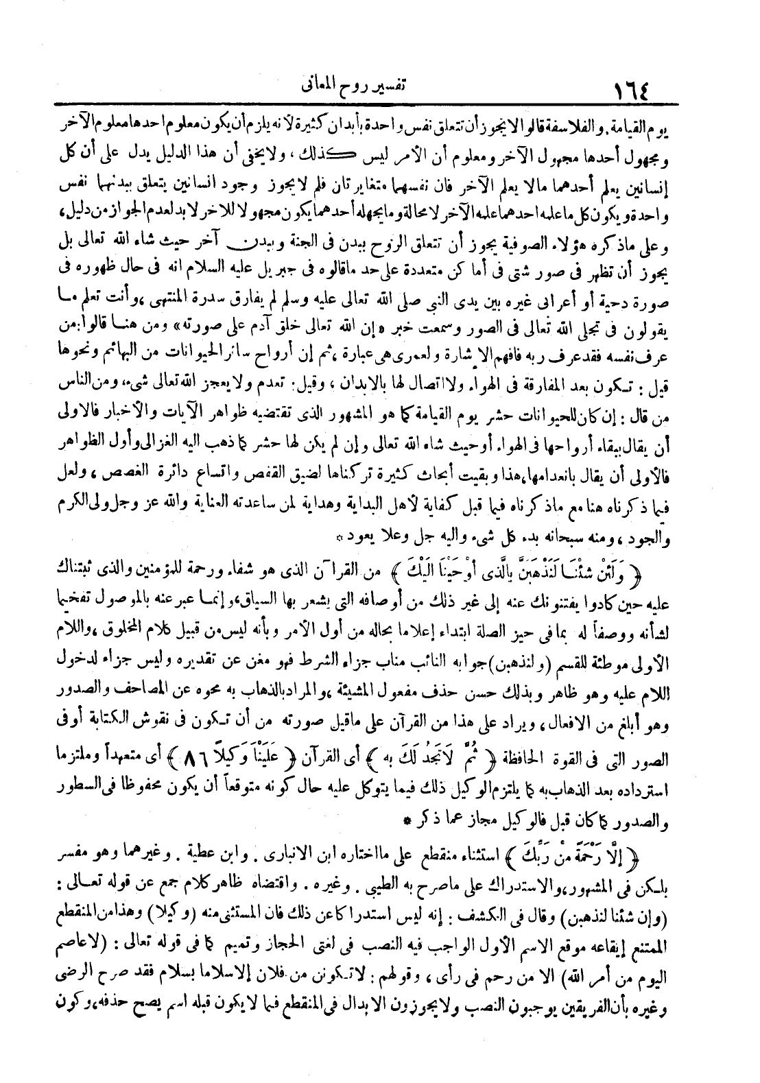 إلا رحمة من ربك استثناء منقطع على ما اختاره ابن الأنباري وابن عطية وغيرهما وهو مفسر بلكن في المشهور والإستدراك على ما صرح به الطيب وغيره واقتضاه ظاهر كلام جمع عن قوله تعالى : وإن شئنا لنذهبن وقال في الكشف : إنه ليس استدراكا عن ذلك فإن المستثنى منه وكيلا وهذا من المنقطع الممتنع إيقاعه موقع الاسم الأول الواجب فيه النصب في لغتي الحجاز وتميم كما في قوله تعالى : لا عاصم اليوم من أمر الله إلا من رحم في رأى وقولهم : لا تكونن من فلان إلا سلاما بسلام فقد صرح الرضي وغيره بأن الفريقين يوجبون ولا يجوزون الإبدال في المنقطع فما لا يكون قبله اسم يصح حذفه وكون