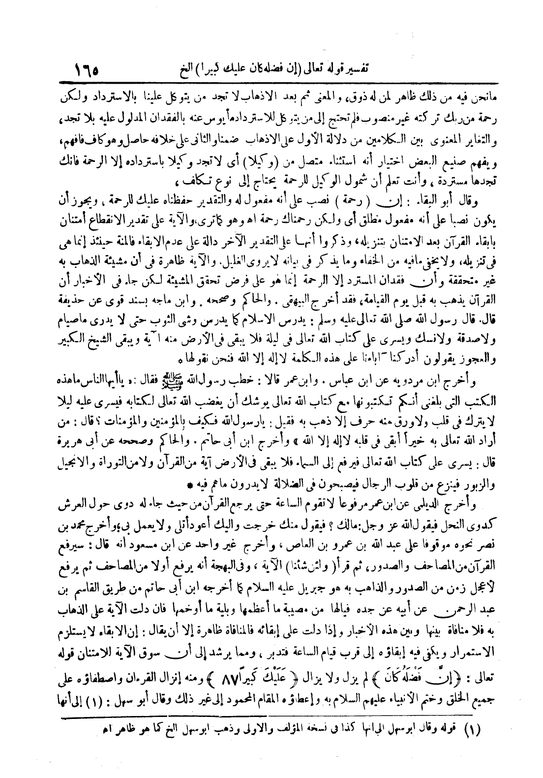 وأخرج الديلمي عن ابن عمر مرفوعا لا تقوم الساعة حتى يرجع القرآن من حيث جاء له دوي حول العرش كدوي النحل فيقول الله عز و جل : مالك فيقول منك خرجت وإليك أعود أتلى ولا يعمل بي وأخرج محمد بن نصر نحوه مرفوعا على عبد الله بن عمرو بن العاص وأخرج غير واحد عن ابن مسعود أنه قال : سيرفع القرآن من المصاحف والصدور ثم قرأ ولئن شئنا الآية وفي البهجة أنه يرفع أولا من المصاحف ثم يرفع لأعجل زمن من الصدور والذاهب به هو جبريل عليه السلام كما أخرجه ابن أبي حاتم من طريق القاسم بن عبد الرحمن عن أبيه عن جده فيالها من مصيبة ما أعظمها وبلية ما أوخمها فإن دلت الآية على الذهاب به فلا منافاة بينها وبين هذه الأخبار وإذا دلت على إبقائه فالمنافاة ظاهرة إلا أن يقال : إن الإبقاء لا يستلزم الاستمرار ويكفي فيه إبقاؤه إلى قرب قيام الساعة فتدبر ومما يرشد إلى أن سوق الآية للامتنان قوله تعالى : إن فضله كان لم يزل ولا يزال عليك كبيرا 78 ومنه إنزال القرآن واصطفاؤه على جميع الخلق وختم الأنبياء عليهم السلام به وإعطاؤه المقام المحمود إلى غير ذلك وقال أبو سهل : إلى أنها
