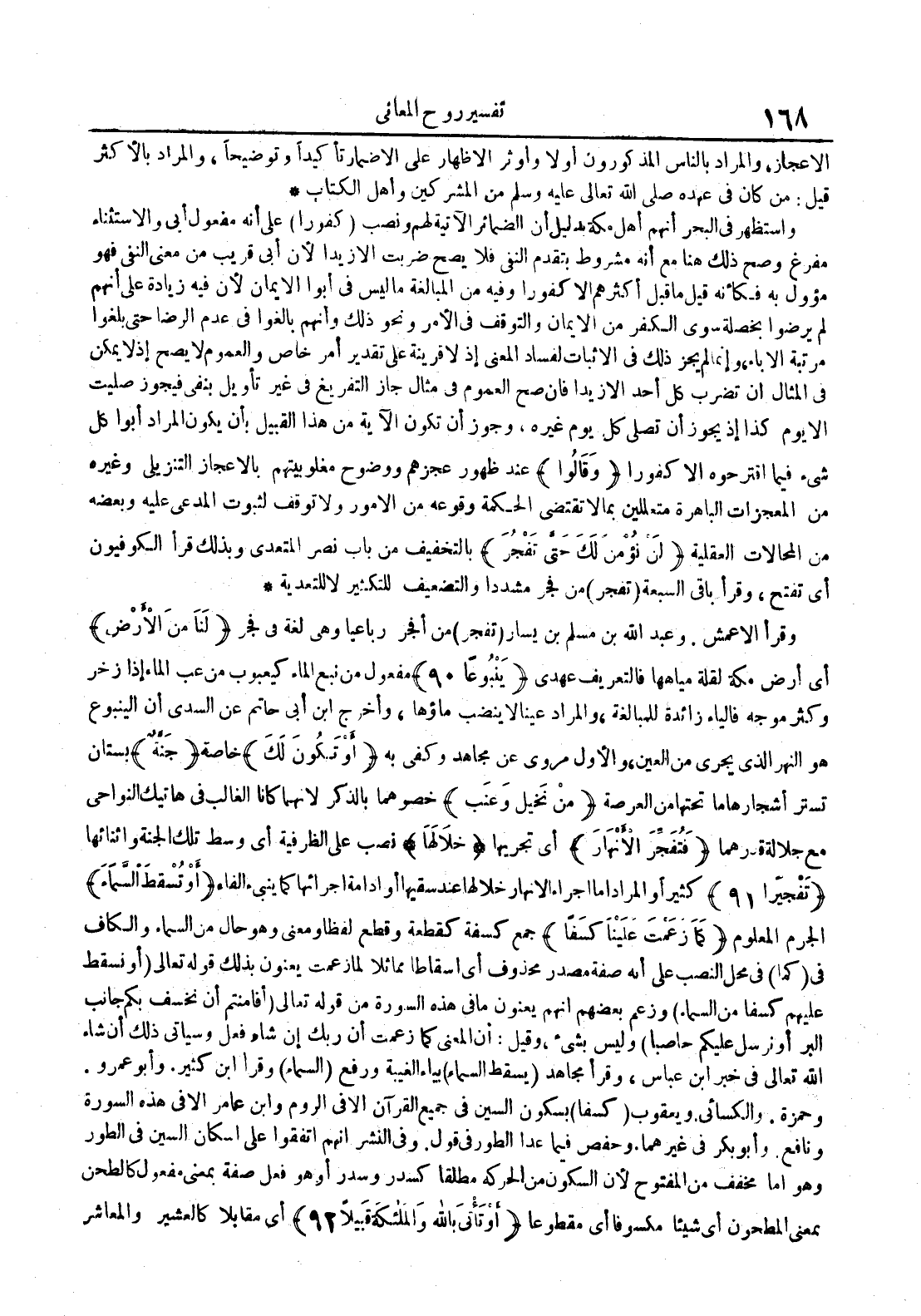 وقرأ الأعمش وعبد الله بن مسلم بن يسار تفجر من أفجر رباعيا وهي لغة في فجر لنا من الأرض أي أرض مكة لقلة مياهها فالتعريف عهدي ينبوعا 09 مفعول من نبع الماء كيعبوب من عب الماء إذا زخر وكثر موجه فالياء زائدة للمبالغة والمراد عينا لا ينضب ماؤها وأخرج ابن أبي حاتم عن السدي لأن الينبوع هو النهر الذي يجري من العين والأول مروي عن مجاهد وكفى به أو تكون لك خاصة جنة بستان تستر أشجارها ما تحتها من العرصة من نخيل وعنب خصوهما بالذكر لأنهما كانا الغالب في هاتيك النواحي مع جلالة قدرهما فتفجر الأنهار أي تجريها خلالها نصب على الظرفية أي وسط تلك الجنة و أثنائها تفجيرا 19 كثيرا والمراد إما إجراء الأنهار خلالها عند سقيها أو إدامة إجرائها كما ينبيء الفاء أو تسقط السماء الجرم معلوم كما زعمت علينا كسفا جمع كسفة كقطعة وقطع لفظا ومعنى وهو حال من السماء والكاف في كما في محل النصب على أنه صفة مصدر محذوف أي اسقاطا مماثلا لما زعمت يعنون بذلك قوله تعالى أو تسقط عليهم كسفا من السماء وزعم بعضهم أنهم يعنون ما في هذه السورة من قوله تعالى أفأمنتم أن نخسف بكم جانب البر أو نرسل عليكم حاصبا وليس بشيء وقيل : أن المعنى كما زعمت أن ربك إن شاء فعل وسيأتي ذلك إن شاء الله تعالى في خبر ابن عباس وقرأ مجاهد يسقط السماء بياء الغيبة ورفع السماء وقرأ ابن كثير وأبو عمرو وحمزة والكسائي ويعقوب كسفا بسكون السين في جميع القرآن إلا في الروم وابن عامر إلا في هذه السورة ونافع وأبو بكر في غيرهما وحفص فيما عدا الطور في قول وفي النشر أنهم اتفقوا على إسكان السين في الطور وهو إما مخفف من المفتوح لأن السكون من الحركة مطلقا كسدر وسدر أو هو فعل صفة بمعنى مفعول كالطحن بمعنى المطحون أي شيئا مكسوفا أي مقطوعا م أو تأتي بالله والملائكة قبيلا 29 أي مقابلا كالعشير والمعاشر