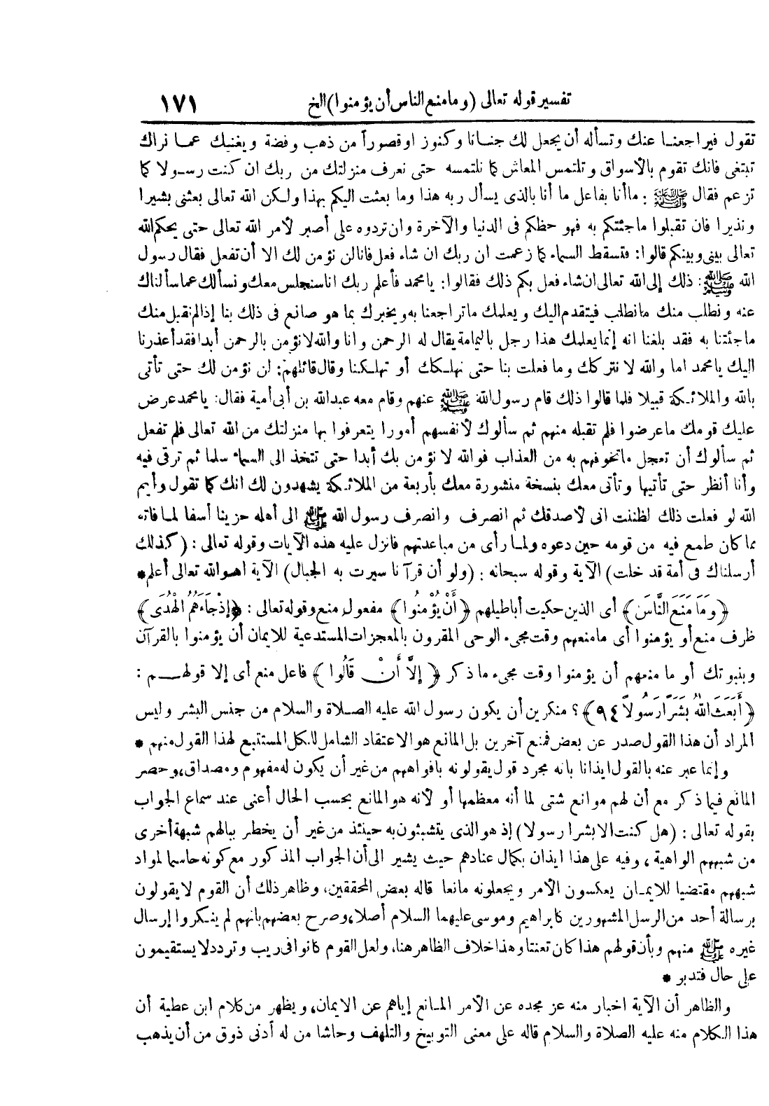 وما منع الناس أي الذين حكيت أباطيلهم أن يؤمنوا مفعول منع وقوله تعالى : إذجاءهم الهدى ظرف منع أو يؤمنوا أي ما منعهم وقت مجيء الوحي المقرون بالمعجزات المستدعية للإيمان أن يؤمنوا بالقرآن وبنبتوك أو ما منعهم أن يؤمنوا وقت مجيء ما ذكر إلا أن قالوا فاعل منع أي إلا قولهم : أبعث الله بشرا رسولا 49 منكرين أن يكون رسول الله عليه الصلاة و السلام من جنس البشر وليس المراد أن هذا القول صدر عن بعض فمنع آخرين بل المانع هو الإعتقاد الشامل للكل المستتبع لهذا القول منهم