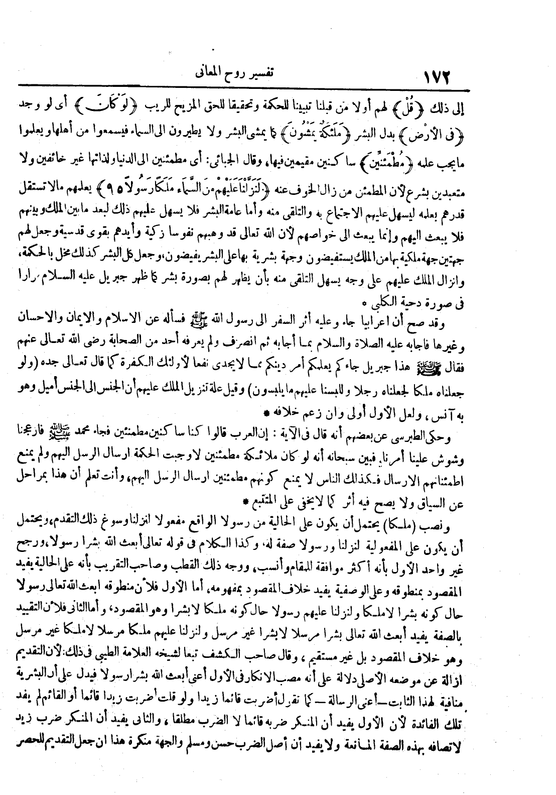 ونصب ملكا يحتمل أن يكون على الحالية من رسولا الواقع مفعولا لنزلنا وسوغ ذلك التقدم ويحتمل أن يكون على المفعولية لنزلنا ورسولا صفة له وكذا الكلام في قوله تعالى أبعث الله بشرا رسولا ورجح غير واحد الأول بأنه أكثر موافقة للمقام وأنسب ووجه ذلك القطب وصاحب التقريب بأنه على الحالية يفيد المقصود بمنطوقه وعلى الوصفية يفيد خلاف المقصود بمفهومه أما الأول فلأن منطوقه أبعث الله تعالى رسولا حال كونه بشرا لا ملكا ولنزلنا عليهم رسولا حال كونه ملكا لا بشرا وهو المقصود وأما الثاني فلأن التقريب بالصفة يفيد أبعث الله تعالى بشرا مرسلا لا بشرا غير مرسل ولنزلنا عليهم ملكا مرسلا لا ملكا غير مرسل وهو خلاف المقصود بل غير مستقيم وقال صاحب الكشف تبعا لشيخه العلامة الطيبي في ذلك : لأن التقديم إزالة عن موضعه الأصلي دلالة على أنه مصب الإنكار في الأول أعني أبعث الله بشرا رسولا فيدل على أن البشرية منافية لهذا الثابت أعني الرسالة كما تقول أضربت قائما زيدا ولو قلت أضربت زيدا قائما أو القائم لم يفد تلك الفائدة لأن الأول يفيد أن المنكر ضربه قائما لا الضرب مطلقا والثاني يفيد أن المنكر ضرب زيد لاتصافه بهذه الصفة المانعة ولا يفيد أن أصل الضرب حسن ومسلم والجهة منكرة هذا أن جعل التقديم للحصر