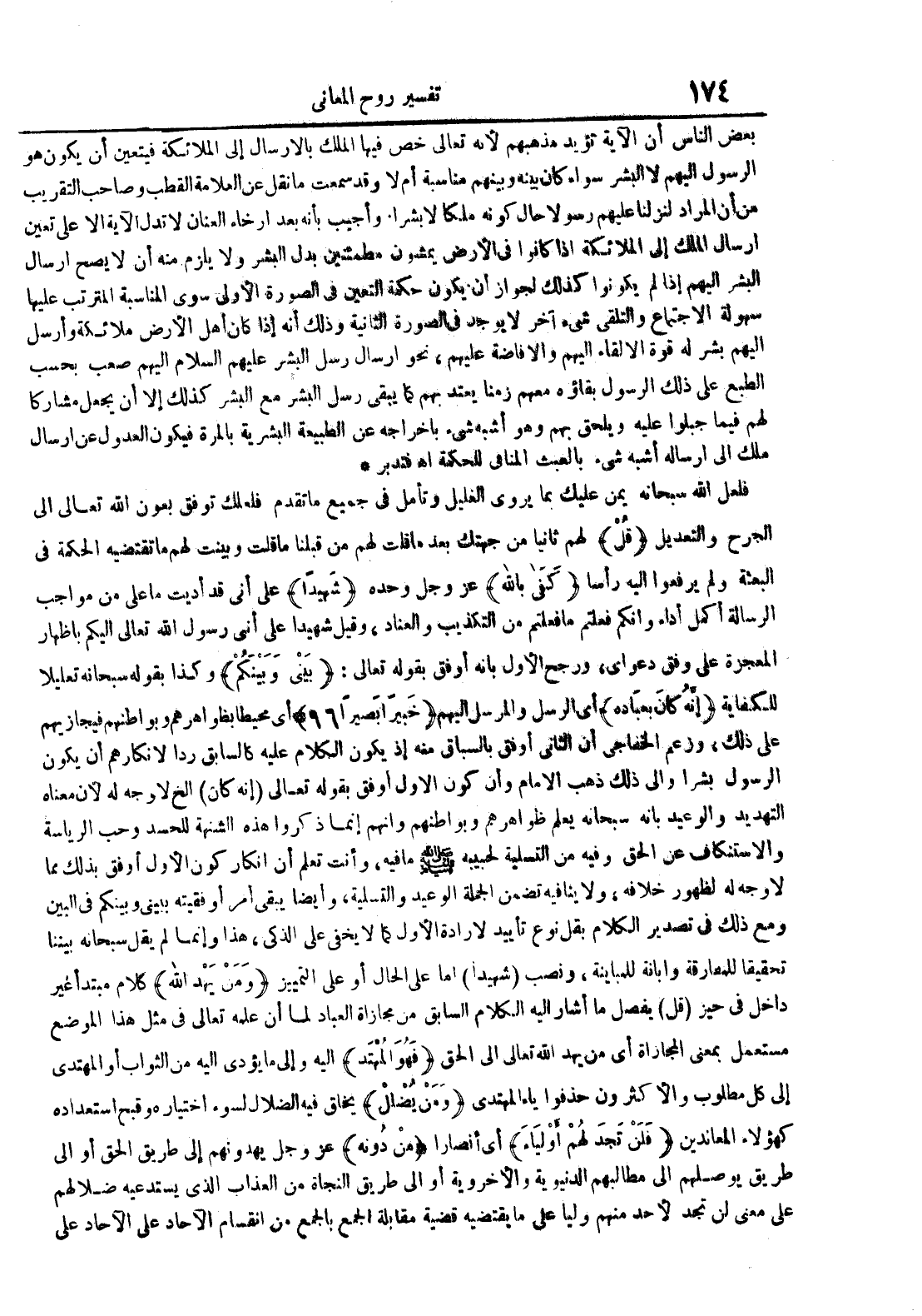 بعض الناس أن الآية تؤيد مذهبهم لأنه تعالى خص فيها الملك بالإرسال إلى الملائكة فيتعين أن يكون هو الرسول إليهم لا البشر سواء كان بينه وبينهم مناسبة أم لا وقد سمعت ما نقل عن العلامة القطب وصاحب التقريب من أن المراد لنزلنا عليهم رسولا حال كونه ملكا لا بشرا وأجيب بأنه بعد إرخاء العنان لا تدل الآية إلا على تعين إرسال الملك إلى الملائكة إذا كانوا في الأرض يمشون مطمئنين بدل البشر ولا يلزم منه أن لا يصح إرسال البشر إليهم إذا لم يكونوا كذلك لجواز أن يكون حكمة التعين في الصورة الأولى سوى المناسبة المترتب عليها سهولة الإجتماع والتلقي شيء آخر لا يوجد في الصورة الثانية وذلك أنه إذا كان أهل الأرض ملائكة وأرسل إليهم بشر له قوة الإلقاء إليهم والإضافة عليهم نحو إرسال رسل البشر عليهم السلام صعب بحسب الطبع على ذلك الرسول بقاؤه معهم زمنا يعتد بهم كما يبقى رسل البشر مع البشر كذلك إلا أن يجعل مشاركا لهم فيما جبلوا عليه ويلحق بهم وهو أشبه شيء بإخراجه عن الطبيعة البشرية بالمرة فيكون العدول عن إرسال ملك إلى إرساله أشبه شيء بالعبث المنافي للحكمة ا ه فتدبر