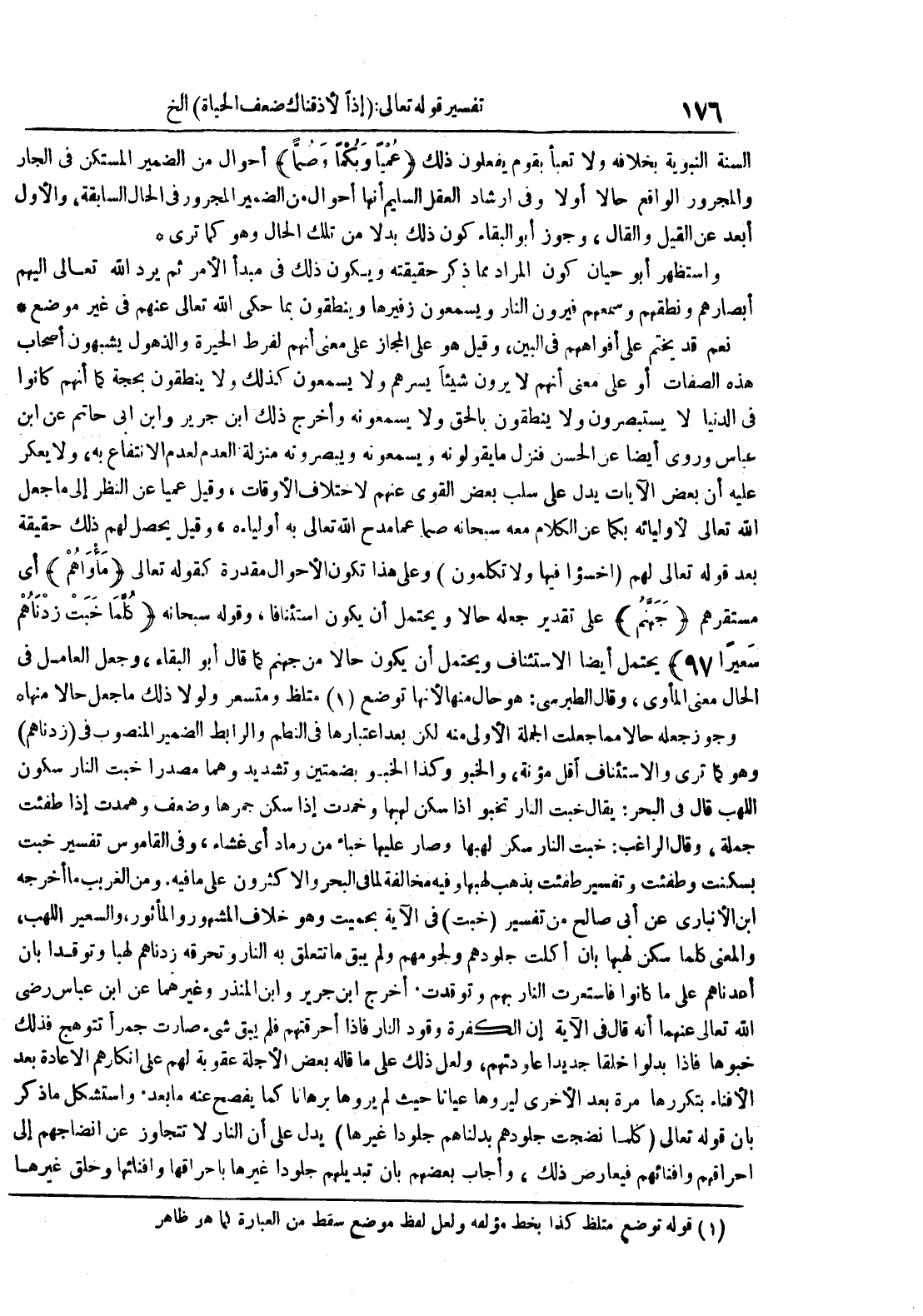 وجوز جعله حالا مما جعلت الجنة الأولى منه لكن بعد اعتبارها في النظم والرابط الضمير المنصوب في زدناهم وهو كما ترى والاستئناف أقل مؤنة والخبو وكذا الخبو بضمتين وتشديد وهما مصدرا خبت النار سكون اللهب قال في البحر : يقال خبت النار تخبو إذا سكن لهبها وخمدت إذا سكن جمرها وضعف وهمدت إذا طفئت جملة وقال الراغب : خبت النار سكن لهبها وصار عليها خباء من رماد أي غشاء وفي القاموس تفسير خبت بسكنت وطفئت وتفسير طفئت بذهب لهبها وفيه مخالفة لما في البحر والأكثرون على ما فيه والغريب ما أخرجه ابن الأنباري عن أبي صالح من تفسير خبت في الآية بحميت وهو خلاف المشهور والمأثور والسعير اللهب والمعنى كلما سكن لهبها بأن أكلت جلودهم ولحومهم ولم يبق ما تتعلق به النار وتحرقه زدناهم لهبا وتوقدا بأن أعدناهم على ما كانوا فاستعرت النار بهم وتوقدت أخرج ابن جرير وابن المنذر وغيرهما عن ابن عباس رضي الله تعالى عنهما أنه قال في الآية إن الكفرة وقود النار فإذا أحرقتهم فلم يبق شيء صارت جمرا تتوهج كذلك خبوها فإذا بدلوا خلقا جديدا عاودتهم ولعل ذلك على ما قاله بعض الأجلة عقوبة لهم على إنكارهم الإعادة بعد الأفناء بتكررها مرة بعد الأخرى ليروها عيانا حيث لم يروها برهانا كما يفصح عنه ما بعد واستشكل ماذكر بأن قوله تعالى كلما نضجت جلودهم بدلناها جلودا غيرها يدل على أن النار لا تتجاوز عن إنضاجهم إلى إحراقهم وإفنائهم فيعارض ذلك وأجاب بعضهم بأن تبديلهم جلودا غيرها بإحراقها وإفنائها وخلق غيرها