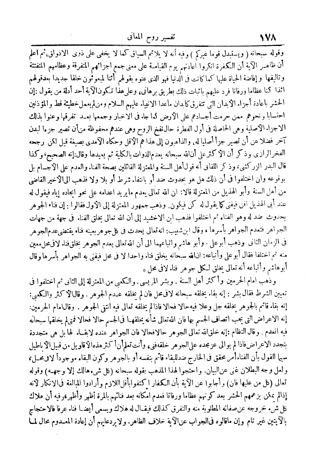 وذهب إمام الحرمين وأكثر أهل السنة وبشر المريسي والكعبي من المعتزلة إلى الثاني ثم اختلفوا في تعيين الشرط فقال بشر : إنه بقاء يخلقه سبحانه لا في محل فإن لم يخلقه عدم الجوهر وقال الأكثر والكعبي : إنه بقاء قائم بالجوهر يخلقه جل وعلا فيه حالا فحالا فإذا لم يخلقه تعالى فيه انتفى الجوهر وقال إمام الحرمين : إنه الإعراض التي يجب اتصاف الجسم بها فإن الله تعالى شأنه يخلقها في الجسم حالا فحالا فمتى لم يخلقها سبحانه فيه انعدم وقال النظام : إنه خلق الله تعالى الجوهر حالا فحالا فإن الجواهر عنده لا بقاء لها بل هي متجددة بتجدد الأعراض فإذا لم يوالي عن مجده على الجوهر خلقه فنى وأنت تعلم أن أكثر هذه الأقاويل من قبيل الأباطيل سيما القول بأن الفناء أمر محقق في الخارج ضد للبقاء قائم بنفسه أو بالجوهر وكون البقاء موجودا لا في محل ولعل وجه البطلان غني عن البيان واحتجوا لهذا المذهب بقوله سبحانه كل شيء هالك إلا وجهه وقوله تعالى كل من عليها فان وأجابوا عن الآية بأن الكفار اكتفوا بأقل اللازم وأرادوا المبالغة في الإنكار لأنه إذا لم يمكن بزعمهم الحشر بعد كونهم عظاما ورفاتا فعدم إمكانه بعد فنائهم بالمرة أظهر وأظهر وفيه أن هلاك كل شيء خروجه عن صفاته المطلوبة منه والتفرق كذلك فيقال له هلاك ويسمى أيضا فناء عرفا فالإحتجاج بالآيتين غير تام وإن ما قالوه في الجواب عن الآية خلاف الظاهر ولا يرد عليهم أن إعادة المعدوم محال لما