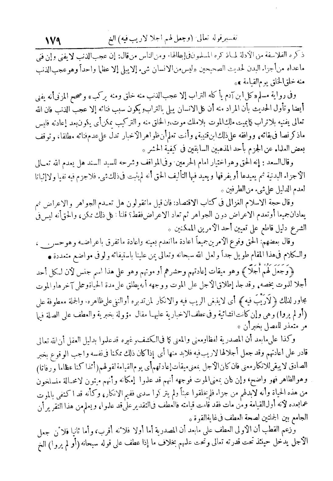 وقال السعد : إنه الحق وهو اختيار إمام الحرمين وفي المواقف وشرحه للسيد السند هل يعدم الله تعالى الأجزاء البدنية ثم يعيدها أو يفرقها ويعيد فيها التأليف الحق أنه لم يثبت في ذلك شيء فلا جزم فيه نفيا ولا إثباتا لعدم الدليل على شيء من الطرفين