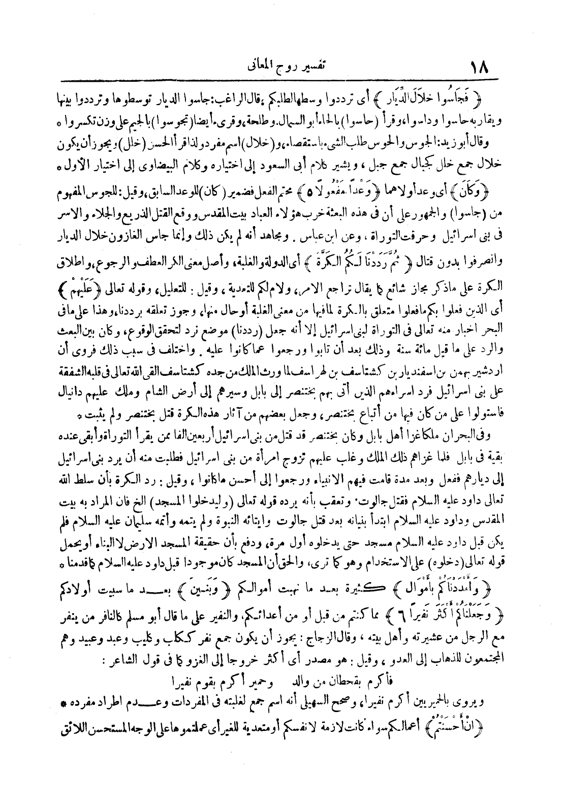 وكان أي وعد أولاهما وعدا مفعولا 5 محتم الفعل فضمير كان للوعد السابق وقيل : للجوس المفهوم من جاسوا والجمهور على أن في هذه البعثة خرب هؤلاء العباد بيت المقدس ووقع القتل الذريع والجلاء والأسر في بني إسرائيل وحرقت التوراة وعن ابن عباس ومجاهد أنه لم يكن ذلك وإنما جاس الغازون خلال الديار وانصرفوا بدون قتال ثم رددنا لكم الكرة أي الدولة والغلبة وأصل معنى الكر العطف والرجوع وإطلاق الكرة على ما ذكر مجاز شائع كما يقال تراجع الأمر ولام لكم للتعدية وقيل : للتعليل وقوله تعالى عليهم أي الذين فعلوا بكم ما فعلوا متعلق بالكرة لما فيها من معنى الغلبة أو حال منها وجوز تعلقه برددنا وهذا على ما في البحر إخبار منه تعالى في التوراة لبني إسرائيل إلا أنه جعل رددنا موضع نرد لتحقق الوقوع وكان بين البعث والرد على ما قيل مائة سنة وذلك بعد أن تابوا ورجعوا عما كانوا عليه واختلف في سبب ذلك فروي أن أزدشير بهمن بن اسفنديار بن كشتاسف بن لهراسف لما ورث الملك من جده كشتاسف ألقى الله تعالى في قلبه الشفقة على بني إسرائيل فرد أسراءهم الذين أتى بهم بختنصر إلى بابل وسيرهم إلى أرض الشام وملك عليهم دانيال فاستولوا على من كان فيها من أتباع بختنصر وجعل بعضهم من آثار هذه الكرة قتل بختنصر ولم يتبت