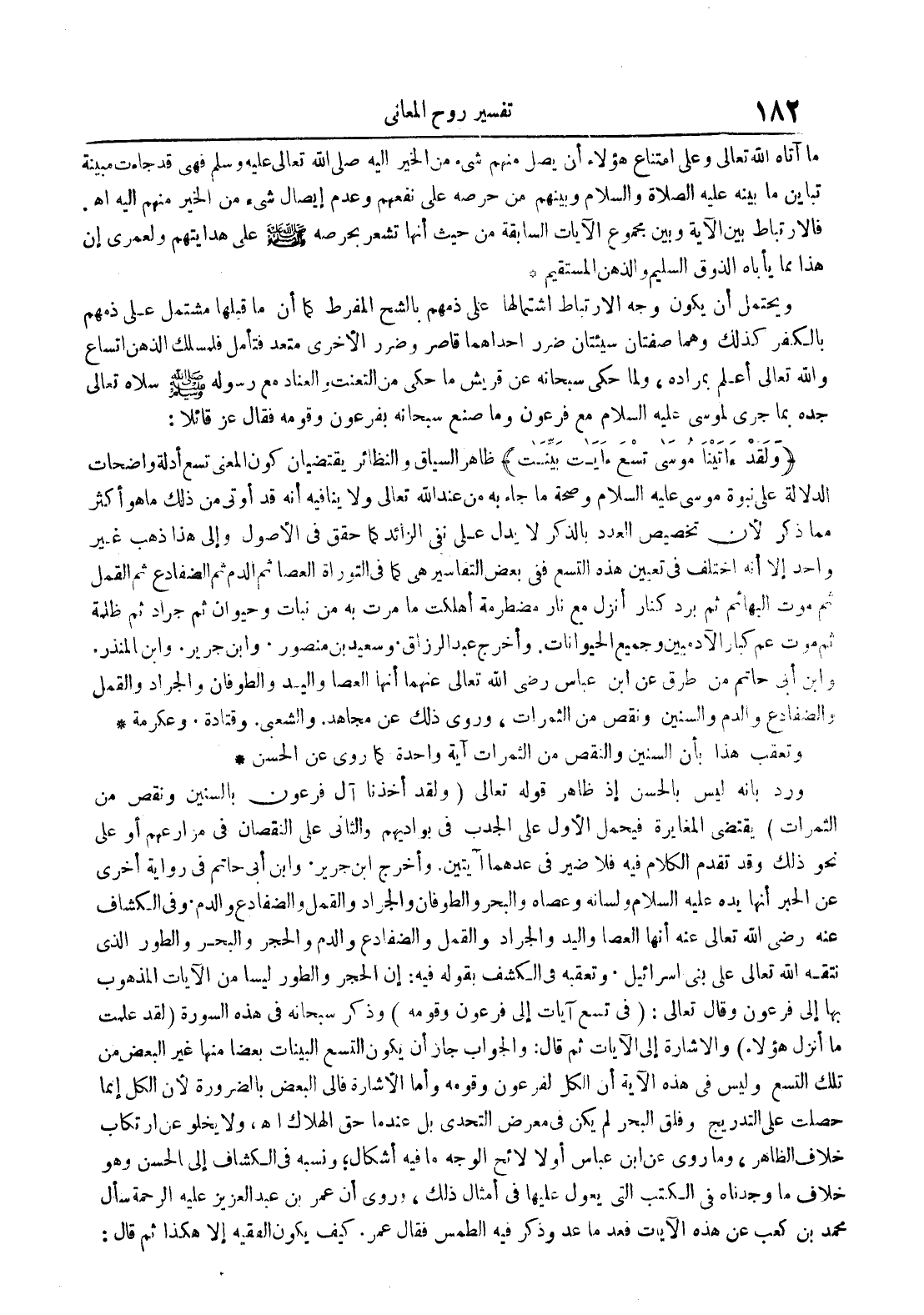 ويحتمل أن يكون وجه الارتباط اشتمالها على ذمهم بالشح المفرط كما أن ما قبلها مشتمل على ذمهم بالكفر كذلك وهما صفتان سيئتان ضرر إحداهما قاصر وضرر الأخرى متعد فتأمل فلمسلك الذهن اتساع والله تعالى أعلم بمراده ولما حكى سبحانه عن قريش ما حكى من التعنت والعناد مع رسوله سلاه تعالى جده بما جرى لموسى عليه السلام مع فرعون وما صنع سبحانه بفرعون وقومه فقال عز قائلا : ولقد ءاتينا موسى تسع ءايت بينت ظاهر السياق والنظائر يقتضيان كون المعنى تسع أدلة واضحات الدلالة على نبوة موسى عليه السلام وصحة ما جاء به من عند الله تعالى ولا ينافيه أنه قد أوتي من ذلك ما هو أكثر مما ذكر لأن تخصيص العدد بالذكر لا يدل على نفي الزائد كما حقق في الأصول وإلى هذا ذهب غير واحد إلا أنه اختلف في تعيين هذه التسع ففي بعض التفاسير هي كما في التوراة العصا ثم الدم ثم الضفادع ثم القمل ثم موت البهائم ثم برد كنار أنزل مع نار مضطرمة أهلكت ما مرت به من نبات وحيوان ثم جراد ثم ظلمة ثم موت عم كبار الآدميين وجميع الحيوانات وأخرج عبد الرزاق وسعيد بن منصور وابن جرير وابن المنذر وابن أبي حاتم من طرق عن ابن عباس رضي الله تعالى عنهما أنها العصا واليد والطوفان والجراد والقمل والضفادع والدم والسنين ونقص من الثمرات وروى ذلك عن مجاهد والشعبي وقتادة وعكرمة