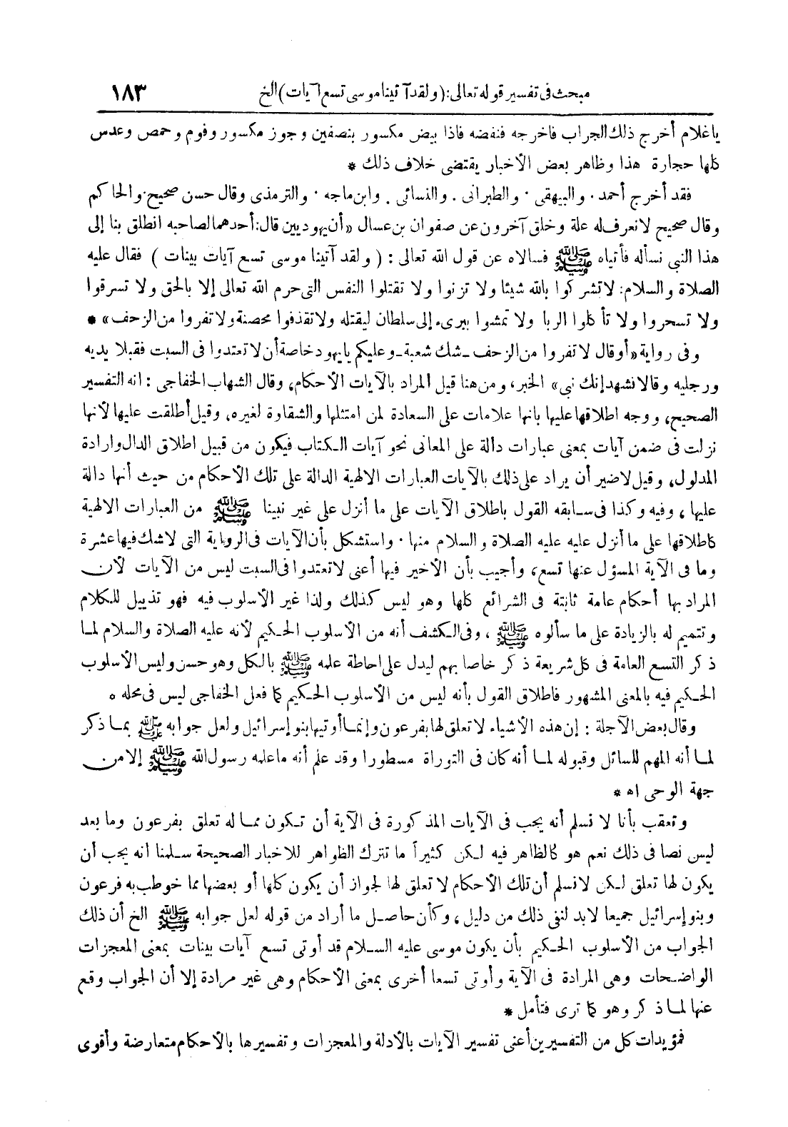 وفي رواية أو قال لا تفروا من الزحف شك شعبة وعليكم يا يهود خاصة ألا تعتدوا في السبت فقبلا يديه ورجليه وقالا نشهد إنك نبي الخبر ومن هنا قيل المراد بالآيات الأحكام وقال الشهاب الخفاجي : إنه التفسير الصحيح ووجه إطلاقها عليها بأنها علامات على السعادة لمن امتثلها والشقاوة لغيره وقيل أطلقت عليها لأنها نزلت في ضمن آيات بمعنى عبارات دالة على المعاني نحو آيات الكتاب فيكون من قبيل إطلاق الدال وإرادة المدلول وقيل لا ضير أن يراد على ذلك ب 2 الآيات العبارات الإلهية الدالة على تلك الأحكام من حيىث أنها دالة عليها وفيه وكذا في سابقه القول بإطلاق الآيات على ما أنزل على غير نبينا من العبارات الإلهية كإطلاقها على ما أنزل عليه عليه الصلاة و السلام منها واستشكل بأن الآيات في الرواية التي لا شك فيها عشرة وما في الآية المسؤل عنها تسع وأجيب بأن الأخير فيها أعني لا تعتدوا في السبت ليس من الآيات لأن المراد بها أحكام عامة ثابتة في الشرائع كلها وهو ليس كذلك ولذا غير الأسلوب فيه فهو تذييل للكلام وتتميم له بالزيادة على ما سألوه وفي الكشف أنه من الأسلوب الحكيم لأنه عليه الصلاة و السلام لما ذكر التسع العامة في كل شريعة ذكر خاصا بهم ليدل على إحاطة علمه بالكل وهو حسن وليس الأسلوب الحكيم فيه بالمعنى المشهور فإطلاق القول بأنه ليس من الأسلوب الحكيم كما فعل الخفاجي ليس في محله
