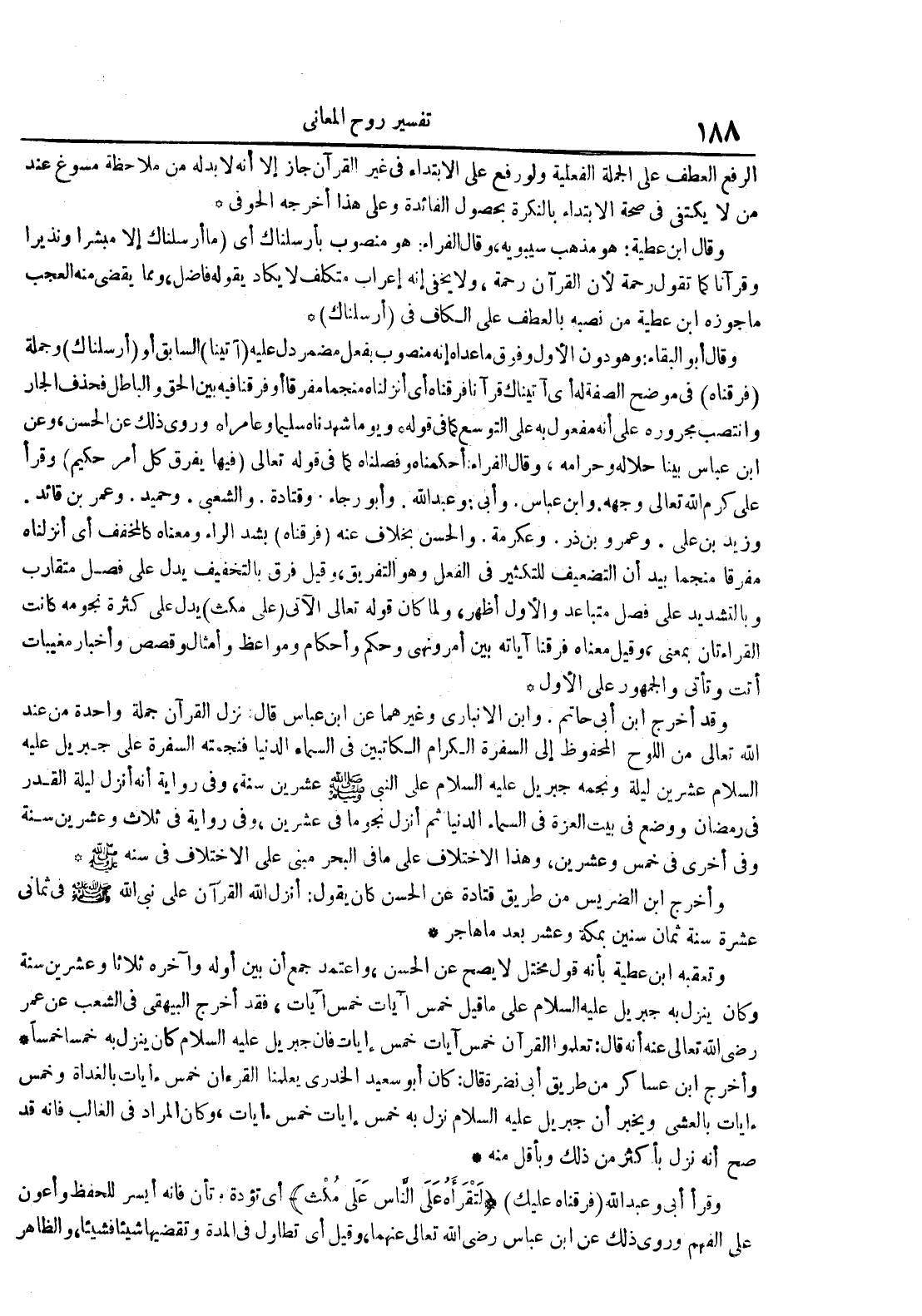 وقد أخرج ابن أبي الحاتم وابن الأنباري وغيرهما عن ابن عباس قال : نزل القرآن جملة واحدة من عند الله تعالى من اللوح المحفوظ إلى السفرة الكرام الكاتبين في السماء الدنيا فنجمته السفرة على جبريل عليه السلام عشرين ليلة ونجمه جبريل عليه السلام على النبي عشرين سنة وفي رواية أنه أنزل ليلة القدر في رمضان ووضع في بيت العزة في السماء الدنيا ثم أنزل نجوما في عشرين وفي رواية في ثلاث وعشرين سنة وفي أخرى في خمس وعشرين وهذا الاختلاف على ما في البحر مبني على الاختلاف في سنه