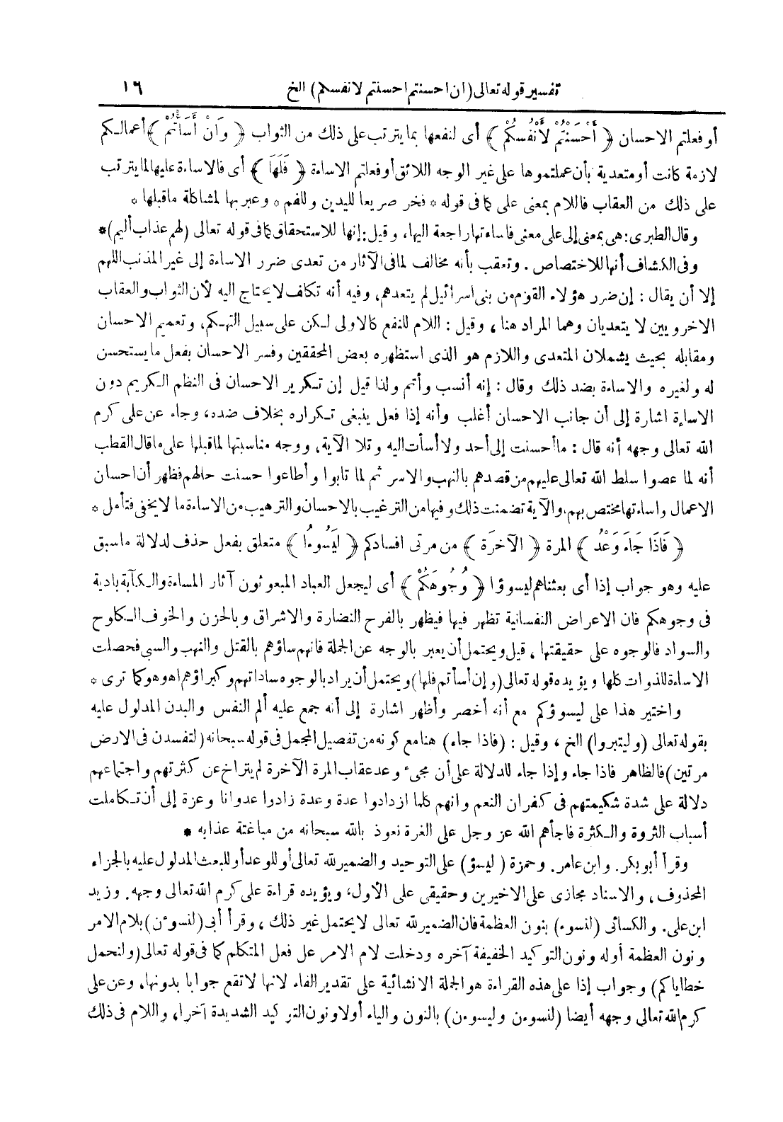 أو فعلتم الإحسان أحسنتم لأنفسكم أي لنفعها بما يترتب على ذلك من الثواب وإن أسأتم أعمالكم لازمة كانت أو متعدية بأن عملتموها على غير الوجه اللائق أو فعلتم الاساءة فلها أي فالإساءة عليها لما يترتب على ذلك من العقاب فاللام بمعنى على كما في قوله