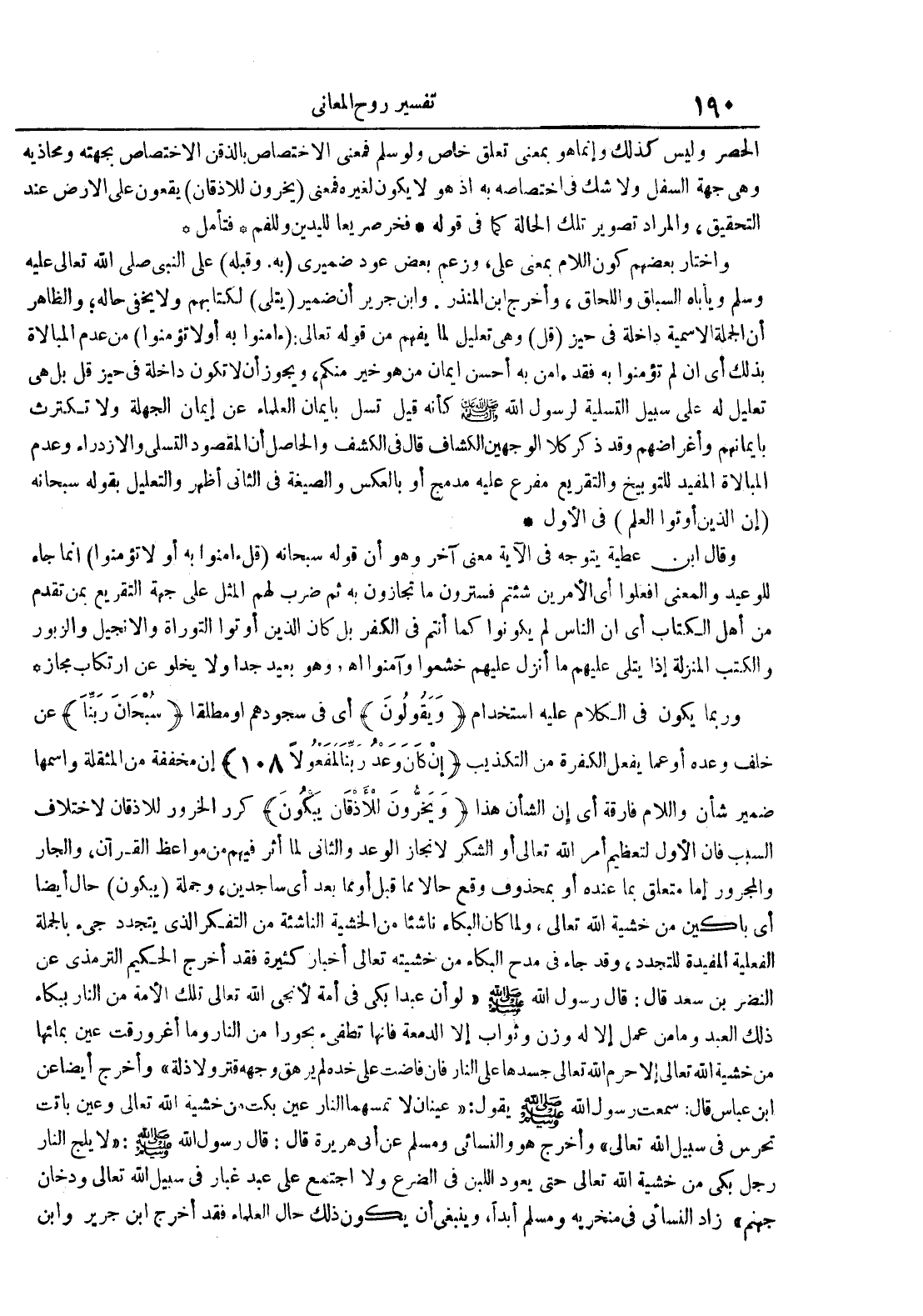 وربما يكون في الكلام عليه استخدام ويقولون أي في سجودهم أو مطلقا سبحان ربنا عن خلف وعده أو عما يفعل الكفرة من التكذيب إن كان وعد ربنا لمفعولا 801 إن مخففة من المثقلة واسمها ضمير شأن واللام فارقة أي إن الشأن هذا ويخرون للأذقان يبكون كرر الخرور للأذقان لاختلاف السبب فإن الأول لتعظيم أمر الله تعالى أو الشكر لإنجاز الوعد والثاني لما أثر فيهم من مواعظ القرآن والجار والمجرور إما متعلق بما عنده أو بمحذوف وقع حالا مما قبل أو مما بعد أي ساجدين وجملة يبكون حال أيضا أي باكين من خشية الله تعالى ولما كان البكاء ناشئا من الخشية الناشئة من التفكر الذي يتجدد جيء بالجملة الفعلية المفيدة للتجدد وقد جاء مدح البكاء من خشيته تعالى أخبار كثيرة فقد أخرج الترمذي عن النضر بن سعد قال : قال رسول الله لو أن عبدا بكى في أمة لأنجى الله تعالى تلك الأمة من النار ببكاء ذلك العبد وما من عمل إلا له وزن وثواب إلا الدمعة فإنها تطفيء بحورا من النار وما أغرورقت عين بمائها من خشية الله تعالى إلا حرم الله تعالى جسدها على النار فإن فاضت على خده لم يرهق وجهه قتر ولا ذلة وأخرج أيضا عن ابن عباس قال : سمعت رسول الله يقول : عينان لا تمسهما النار عين بكت من خشية الله تعالى وعين باتت تحرس في سبيل الله تعالى وأخرج هو والنسائي ومسلم عن أبي هريرة قال : قال رسول الله : لا يلج النار رجل بكى من خشية الله تعالى حتى يعود اللبن في الضرع ولا اجتمع على عبد غبار في سبيل الله تعالى ودخان جهنم زاد النسائي في منخريه ومسلم أبدا وينبغي أن يكون ذلك حال العلماء فقد أخرج ابن جرير وابن