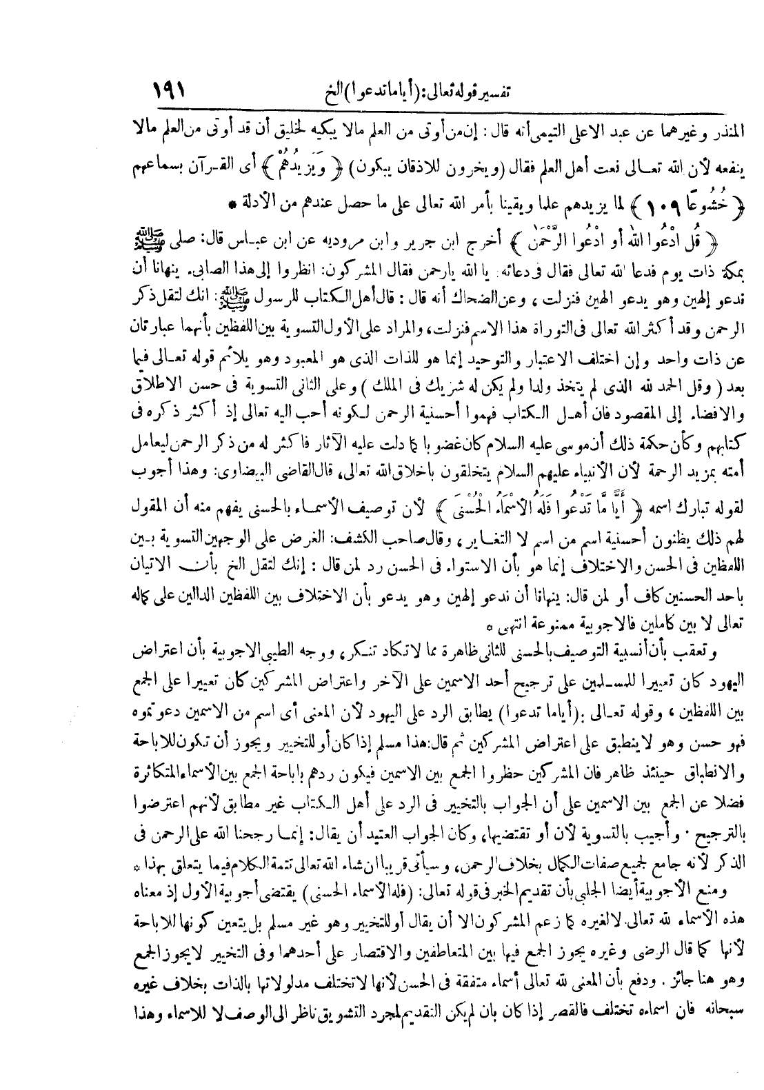 م قل ادعوا الله أو ادعوا الرحمن أخرج ابن جرير وابن مردويه عن ابن عباس قال : صلى بمكة ذات يوم فدعا الله تعالى فقال في دعائه : يا الله يا رحمن فقال المشركون : انظروا إلى هذا الصابيء ينهانا أن ندعو إلهين وهو يدعو إلهين فنزلت وعن الضحاك أنه قال : قال أهل الكتاب للرسول : إنك لتقل ذكر الرحمن وقد أكثر الله تعالى في التوراة هذا الإسم فنزلت والمراد على الأول التسوية بين اللفظين بأنهما عبارتان عن ذات واحد وإن اختلف الإعتبار والتوحيد إنما هو للذات الذي هو المعبود وهو يلائم قوله تعالى فيما بعد وقل الحمد لله الذي لم يتخذ ولدا ولم يكن له شريك في الملك وعلى الثاني التسوية في حسن الإطلاق والإفضاء إلى المقصود فإن أهل الكتاب فهموا أحسنية الرحمن لكونه أحب إليه تعالى إذ أكثر ذكره في كتابهم وكأن حكمة ذلك أن موسى عليه السلام كان غضوبا كما دلت عليه الآثار فأكثر له من ذكر الرحمن ليعامل أمته بمزيد الرحمة لأن الأنبياء عليهم السلام يتخلقون بأخلاق الله تعالى قال القاضي البيضاوي : وهذا أوجب لقوله تبارك اسمه أيا ما تدعوا فله الأسماء الحسنى لأن توصيف الأسماء بالحسنى يفهم منه أن المقول لهم ذلك يظنون أحسنية اسم من اسم لا التغاير وقال صاحب الكشف : الغرض على الوجهين التسوية بين اللفظين في الحسن والإختلاف إنما هو بأن الإستواء في الحسن رد لمن قال : إنك لتقل إلخ بأن الاتيان بأحد الحسنين كاف أو لمن قال : ينهانا أن ندعو إلهين وهو يدعو بأن الإختلاف بين اللفظين الدالين على كماله تعالى لا بين كاملين فالأجوبية ممنوعة انتهى