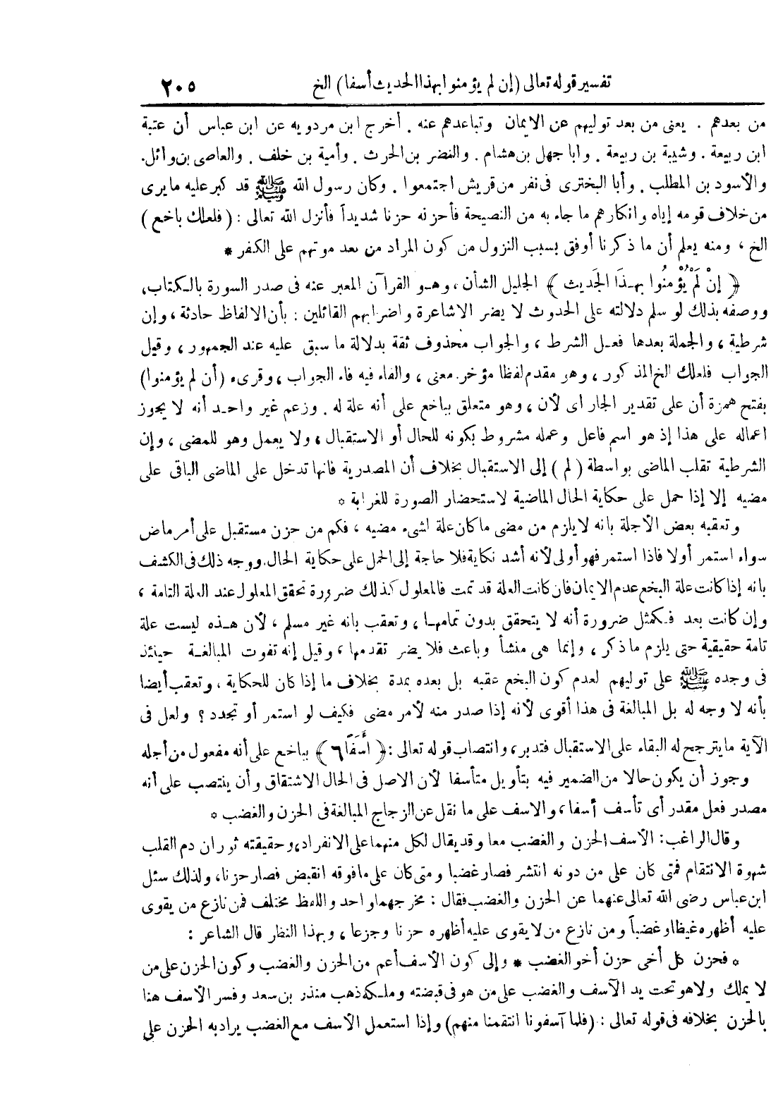 وتعقبه بعض الأجلة بأنه لا يلزم من مضى ما كان علة لشيء مضيه فكم من حزن مستقبل على أمر ماض سواء استمر أو لا فإذا استمر فهو أولى لأنه أشد نكاية فلا حاجة إلى الحمل على حكاية الحال ووجه ذلك في الكشف بأنه إذا كانت البخع عدم الإيمان فإن كانت العلة قد تمت فالمعلول كذلك ضرورة تحقق المعلول عند العلة التامة وإن كانت بعد فكمثل ضرورة أنه لا يتحقق بدون تمامها وتعقب بأنه غير مسلم لأن هذه ليست علة تامة حقيقية حتى يلزم ما ذكر وإنما هي منشأة وباعث فلا يضر تقدمها وقيل أنه تفوت المبالغة حينئذ في وجده على توليهم لعدم كون البخع عقبة بل بعده بمدة بخلاف ما إذا كان للحكاية وتعقب أيضا بأنه لا وجه له بل المبالغة في هذا أقوى لأنه إذا صدر منه لأمر مضى فكيف لو استمر أو تجدد ولعل في الآية ما يترجح له البقاء على الاستقبال وتدبر وانتصاب قوله تعالى : أسفا 6 بباخع على أنه مفعول من أجله وجوز أن يكون حالا من الضمير فيه بتأويل متأسفا لأن الأصل في الحال الإشتقاق وأن ينتصب على أنه مصدر فعل مقدر أي تأسف أسفا والأسف على ما نقل عن الزجاج المبالغة في الحزن والغضب