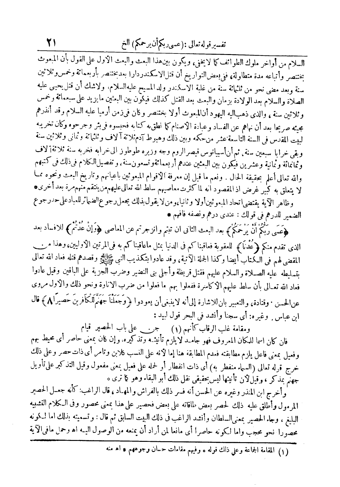 عسى ربكم أن يرحمكم بعد البعث الثاني إن تبتم وانزجرتم عن المعاصي وإن عدتم للإفساد بعد الذي تقدم منكم عدنا للعقوبة فعاقبناكم في الدنيا بمثل ما عاقبناكم به في المرتين الأوليين وهذا من المقتضى لهم في الكتاب أيضا وكذا الجملة الآتية وقد عادوا بتكذيب النبي وقصدهم قتله فعاد الله تعالى بتسليطه عليه الصلاة و السلام عليهم فقتل قريظة وأجلى بني النضير وضرب الجزية على الباقين وقيل عادوا فعاد الله تعالى بأن سلط عليهم الأكاسرة ففعلوا بهم ما فعلوا من ضرب الأتاوة ونحو ذلك والأول مروي عن الحسن وقتادة والتعبير بأن للإشارة إلى أنه لا ينبغي أن يعودوا وجعلنا جهنم للكافرين حصيرا 8 قال ابن عباس وغيره : أي سجنا وأنشد في البحر قول لبيد : ومقامة غلب الرقاب كأنهم جن على باب الحصير قيام فإن كان اسما للمكان المعروف فهو جامد لا يلزم تأنيثه وتذكيره وإن كان بمعنى حاصر أي محيط بهم وفعيل بمعنى فاعل يلزم مطابقته فعدم المطابقة هنا إما لأنه على النسب كلاين وتامر أي ذات حصر وعلى ذلك خرج قوله تعالى السماء منفطر به