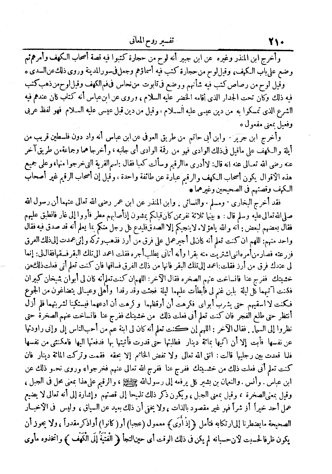 مفقد أخرج البخاري ومسلم والنسائي وابن المنذر عن ابن عمر رضي الله تعالى عنهما أن رسول الله قال : بينما ثلاثة نفر ممن كان قبلكم يمشون إذا أصابهم مطر فأووا إلى غار فانطبق عليهم فقال بعضهم لبعض : إنه والله يا هؤلاء لا ينجيكم إلا الصدق فليدع كل رجل منكم بما يعلم أنه قد صدق فيه فقال واحد منهم : اللهم إن كنت تعلم أنه كان لي أجير عمل على فرق من أرز فذهب وتركه وإني عمدت إلى ذلك الفرق فزرعته فصار من أمره أني اشتريت منه بقرا وأنه أتاني يطلب أجره فقلت اعمد إلى تلك البقر فسقها فقال لي : إنما لي عندك فرق من أرز فقلت : اعمد إلى تلك البقر فإنها من ذلك الفرق فساقها فإن كنت تعلم أني فعلت ذلك من خشيتك ففرج عنا فانساخت عنهم الصخرة فقال الآخر : اللهم إن كنت تعلم أنه كان لي أبوان شيخان كبيران فكنت آتيهما كل ليلة بلبن غنم لي فأبطأت عليهما ليلة فجئت وقد رقدا وأهلي وعيالي يتضاغون من الجوع فكنت لا أسقيهم حتى يشرب أبواي فكرهت أن أوقظهما وكرهت أن أدعهما فيستكينا لشربتهما فلم أزل أنتظر حتى طلع الفجر فإن كنت تعلم أني فعلت ذلك من خشيتك ففرج عنا فانساخت عنهم الصخرة حتى نظروا إلى السماء فقال الآخر : اللهم إن كنت تعلم أنه كان لي ابنة عم من أحب الناس إلي وإني راودتها عن نفسها فأبت إلا أن آتيها بمائة دينار فطلبتها حتى رقدت فأتيتها بها فدفعتها إليها فأمكنتني من نفسها فلما قعدت بين رجليها قالت : اتق الله ولا تفض الخاتم إلا بحقه فقمت وتركت المائة دينار فإن كنت تعلم أني فعلت ذلك من خشيتك ففرج عنا ففرج الله تعالى عنهم فخرجوا روى نحو ذلك عن ابن عباس وأنس والنعمان بن بشير كل يرفعه إلى رسول الله والرقيم على هذا بمعنى محل في الجبل وقيل بمعنى الصخرة وقيل الجبل ويكون ذكر ذلك تلميحا إلى قصتهم وإشارة إلى أنه تعالى لا يضيع عمل أحد خيرا أو شرا فهو غير مقصود بالذات ولا يخفى أن ذلك بعيد عن السياق وليس في الأخبار الصحيحة ما يضطرنا إلى ارتكابه فتأمل إذ أوى معمول عجبا أو كانوا أو اذكر مقدرا ولا يجوز أن يكون ظرفا لحسبت لأن حسبانه لم يكن في ذلك الوقت أي حين التجأ الفتية إلى الكهف واتخذوه مأوى
