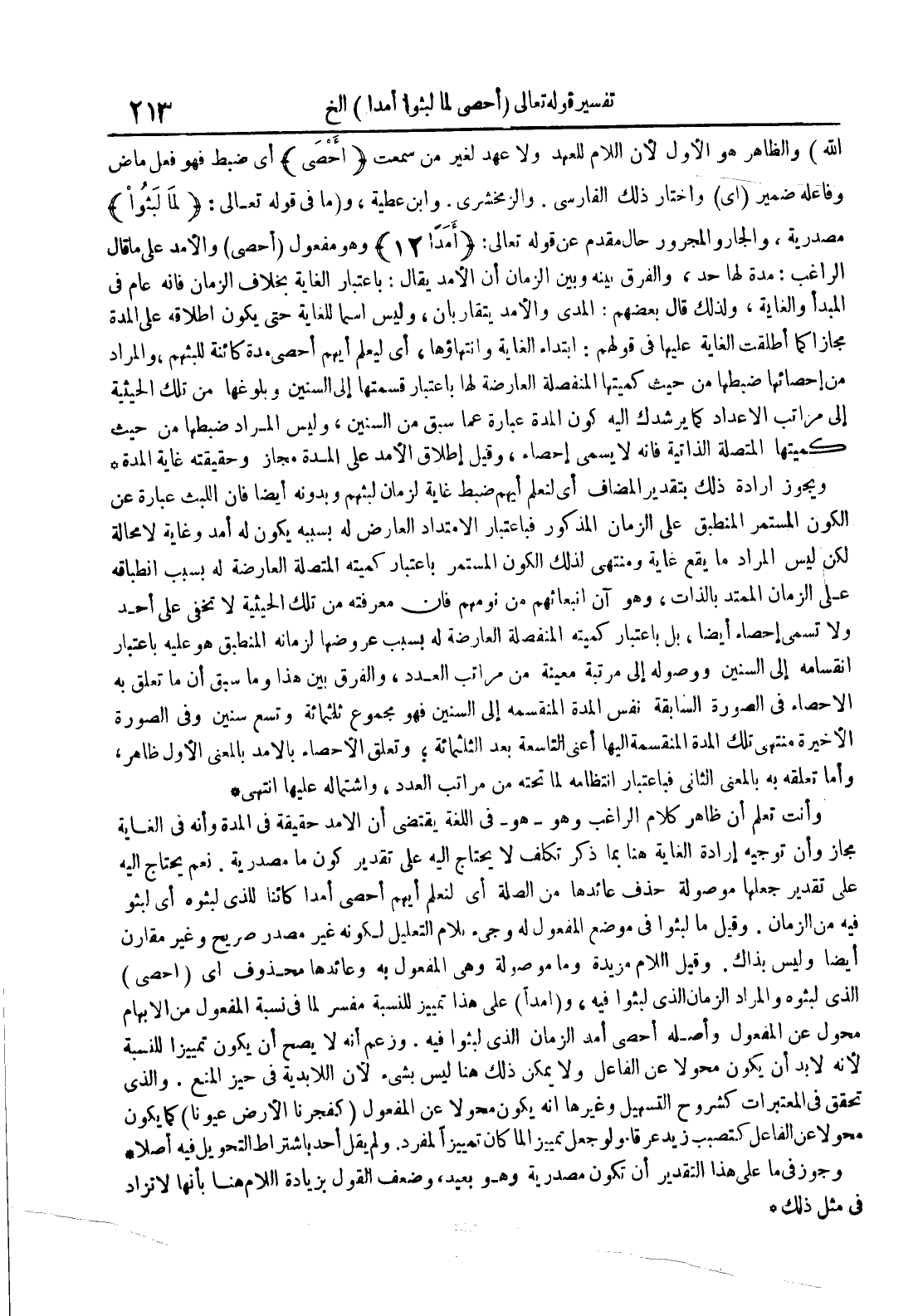 وأنت تعلم ظاهر كلام الراغب وهو هو في اللغة يقتضي أن الأمد حقيقة في المدة وأنه في الغاية مجاز وأن توجيه إرادة الغاية هنا بما ذكر تكلف لا يحتاج إليه على تقدير كون ما مصدرية نعم يحتاج إليه على تقدير جعلها موصولة حذف عائدها من الصلة أي لنعلم أيهم أحصى أمدا كائنا للذي لبثوه أي لبثو فيه من الزمان وقيل ما لبثوا في موضع المفعول له وجيء بلام التعليل لكونه غير مصدر صريح وغير مقارن أيضا وليس بذاك وقيل اللام مزيدة وما موصولة وهي المفعول به وعائدها محذوف أي أحصى الذي لبثوه والمراد الزمان الذي لبثوا فيه و أمدا على هذا تمييز للنسبة مفسر لما في نسبة المفعول من الإبهام محول عن المفعول وأصله أحصى أمد الزمان الذي لبثوا فيه وزعم أنه لا يصح أن يكون تمييزا للنسبة لأنه لابد أن يكون محولا عن الفاعل ولا يمكن ذلك هنا ليس بشيء لأن اللابدية في حيز المنع والذي تحقق في المعتبرات كشروح التسهيل وغيرها أنه يكون محولا عن المفعول كفجرنا الأرض عيونا كما يكون محولا عن الفاعل كتصبب زيد عرقا ولو جعل تمييزا لما كان تمييزا لمفرد ولم يقل أحد باشتراط التحويل فيه أصلا